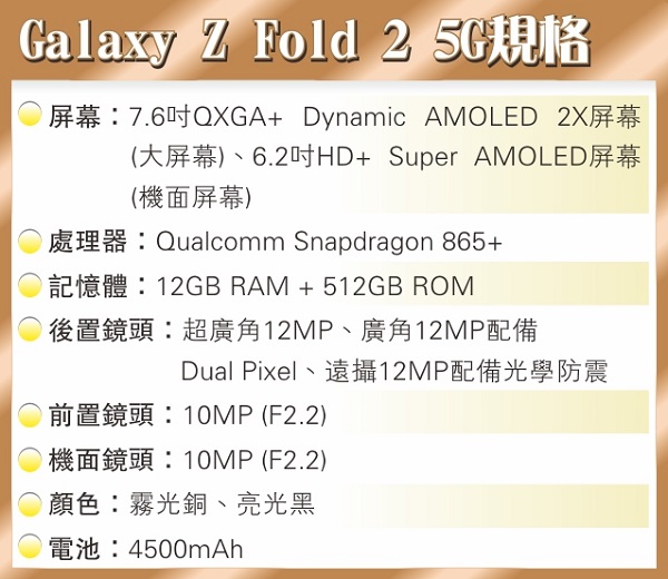在攝力上,備有三個1200萬像素的後置鏡頭,分別為超廣角、廣角和遠攝鏡頭,以及1000萬像素的前置鏡頭和機面鏡頭。上一代的前置鏡頭因有屏幕膠框保護,稱不上美觀。今次新機前置鏡頭採用單鏡及開孔式設計,打開屏幕後造型一體化,感覺簡潔。加上專業影片模式、一攝多拍、極黑亮攝及夜間模式等多項拍攝功能,用戶可利用摺疊屏幕的特性,製作出更具創意的照片或影片。搭載Snapdragon 865+處理器支援5G網絡連接,迎合5G極速網絡。4500mAh電池容量提供長時間續航能力。Galaxy Z Fold 2 5G在整體上把上一代的問題解決及作出實用性的提升,愛追科技的讀者會滿意收貨,只是新機售價近17,000港元,要考慮的應是售價問題了。