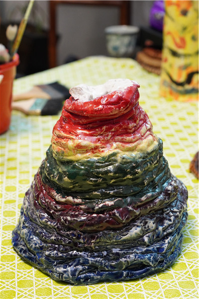 樹木是廖東梅常畫的題材,讀者有沒有留意港鐵佐敦站內有一幅柿子樹壁畫?那是廖東梅的作品,燦爛多彩的柿子樹奪人眼目,教人每次經過都會看上幾眼。創作這幅作品,正因為她小時候看到柿子樹周而復始地長葉、開花、結果到落葉的生長過程,她受啟發,便在作品中以柿子樹不同的顏色變化來表現這個過程,寓意有生生不息的生命和鍥而不捨的精神,就可取得理想成果。在記者眼中,廖東梅一如那棵柿子樹,生命力充沛。然而,隨着年齡增長,她的身體狀況每況愈下,「常坐輪椅,痙攣壓迫到神經,她的腰骨、腿部都有痛症,有時痛到要服止痛藥。」廖爸爸心痛地訴說女兒的狀況。但是樂觀的東梅不認命,身體變差,不便繪畫,就轉而創作陶瓷,一握一捏,一具陶泥,一個世界。《生命之塔》是她第一件捏造的陶瓷,彩虹色外表一如其繪畫般色彩繽紛,一圈圈色彩圍成山的模樣,她表示作品反映自己的生命歷程,「一圈圈代表我曾走過的路,最底的藍黑色代表出生時便受疾病折磨,曾『死而復生』,幾次從大病中逃生。一開始生活得很困難,但透過努力,來到香港後終可發揮才能,生命有了新開始,所以變成紅色。最上面的白色代表雲,是我一直往上走的象徵。」