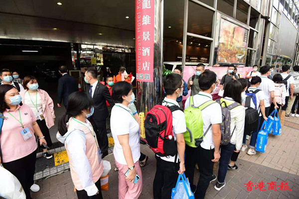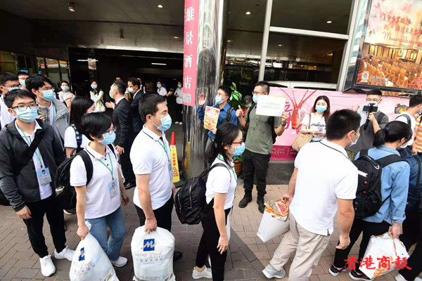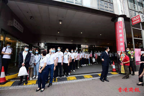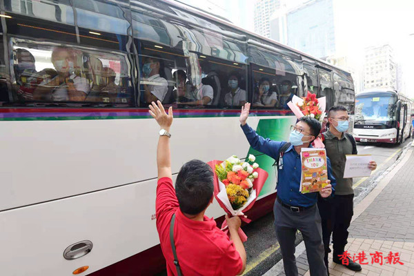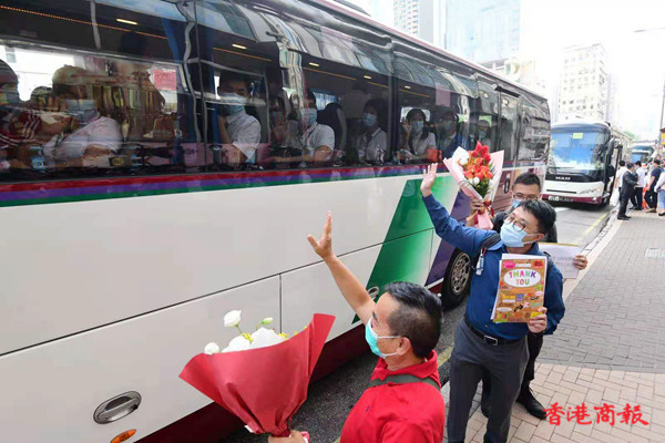 民間團體「政中香港人」4位成員,今午到九龍維景酒店,向內地核酸檢測支援隊致謝並歡送他們離港。支援隊成員見到市民向他們致意,亦親切地揮手作回應。