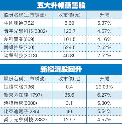 恒生科技指數再度跑贏大市升1.94%,恒騰網絡(136)飆29%,為表現最好科指成分股。舜宇(2382)8月手機鏡頭出貨量增22%,收市升4.6%。酷派(2369)購氫燃料電池業務,收市飆36.6%。比亞迪電子(285)飆5.5%;鴻騰精密(6088)升5.8%。