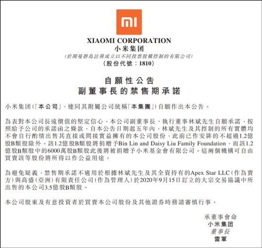 9月15日,小米(01810.HK)公布,小米副董事長、執行董事林斌自願承諾5年內不減持。為避免疑義,禁售期承諾不適用於根據林斌及其全資持有的Apex Star LLC與高盛(亞洲)有限責任公司於9月15日訂立的大宗交易協議中所出售的公司3.5億股B類股,證林斌出手減持小米股份。