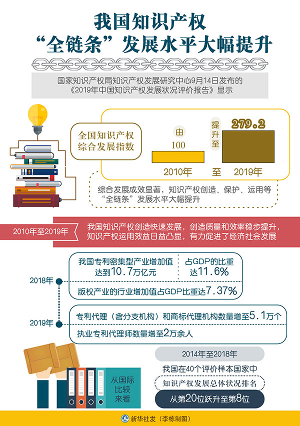 國家知識產權局知識產權發展研究中心14日發布的《2019年中國知識產權發展狀況評價報告》顯示,2010年至2019年,全國知識產權綜合發展指數由100提升至279.2,綜合發展成效顯著,知識產權創造、保護、運用等「全鏈條」發展水平大幅提升。