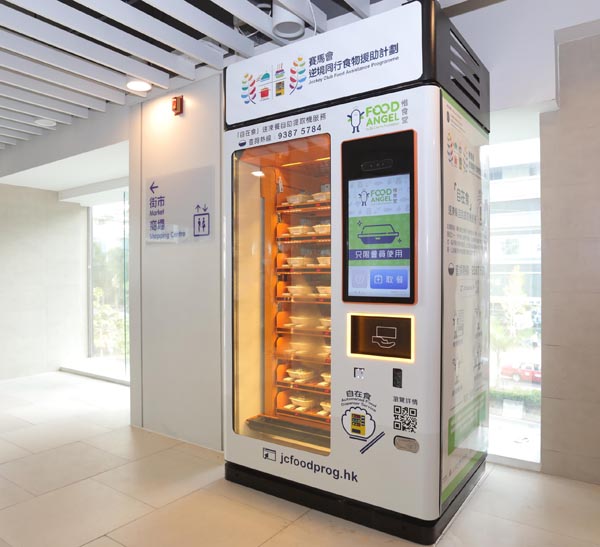 「賽馬會逆境同行食物援助計劃」下的「自在食」速凍餐自助提取機服務,透過自助食物提取機分發由社區廚房準備的速凍餐,彈性的取餐時間適合不同作息時間的人士。