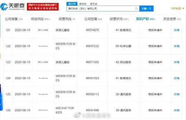 天眼查數據顯示,近日,騰訊科技(深圳)有限公司新增多條商標信息,其中包括多條「微信兒童版」、「WEIXIN FOR KIDS」的商標,商標狀態均顯示為「商標申請中」。