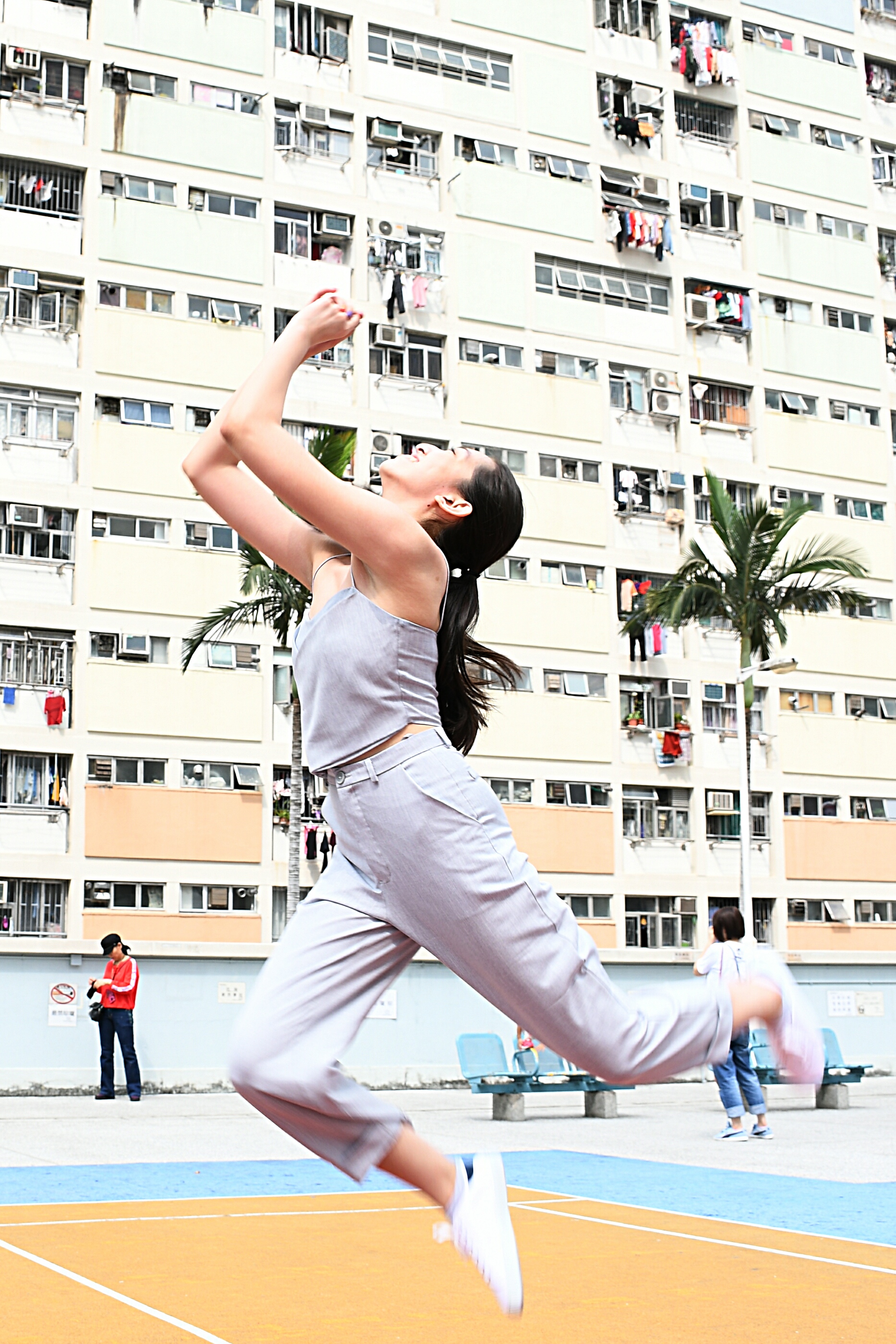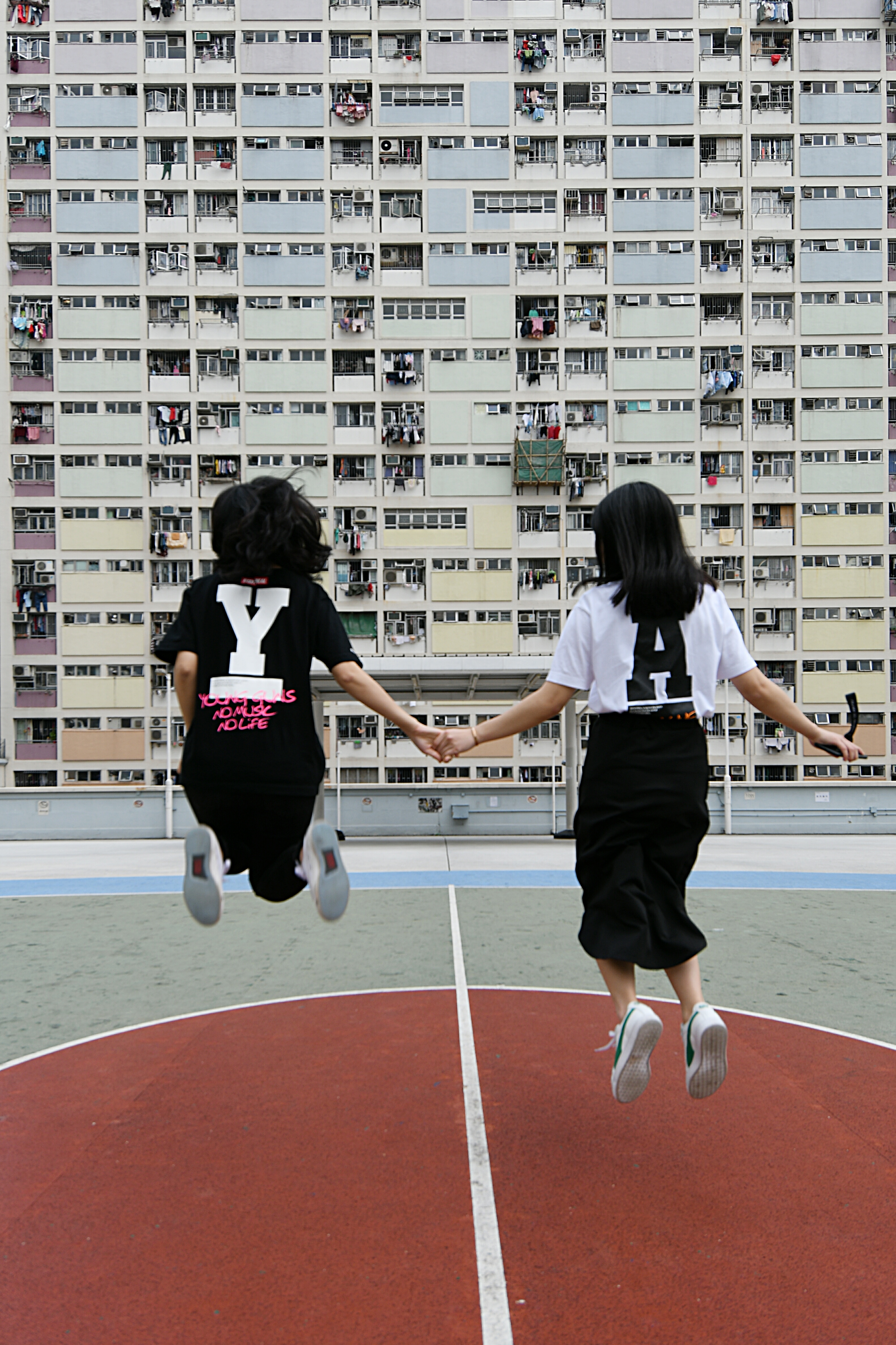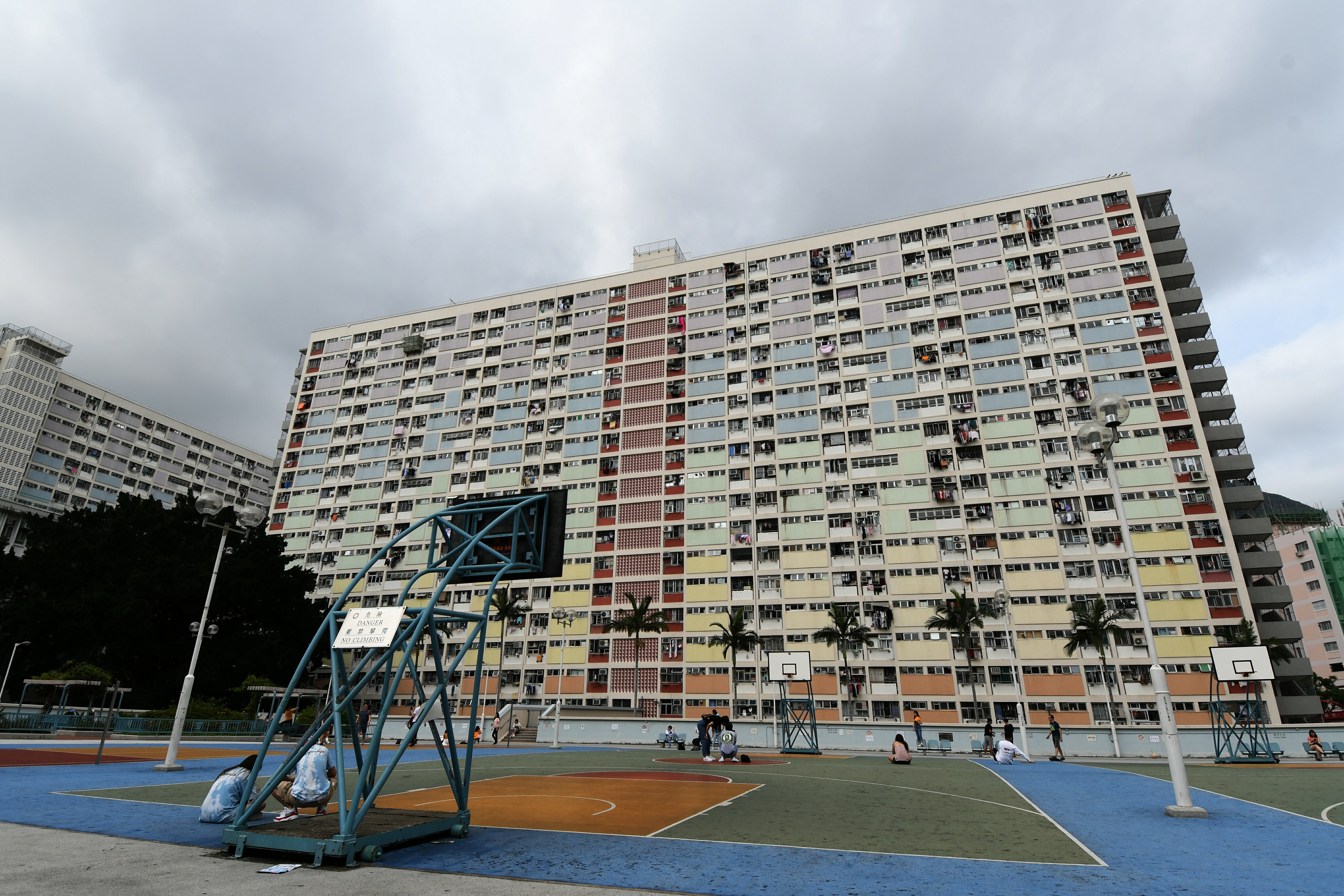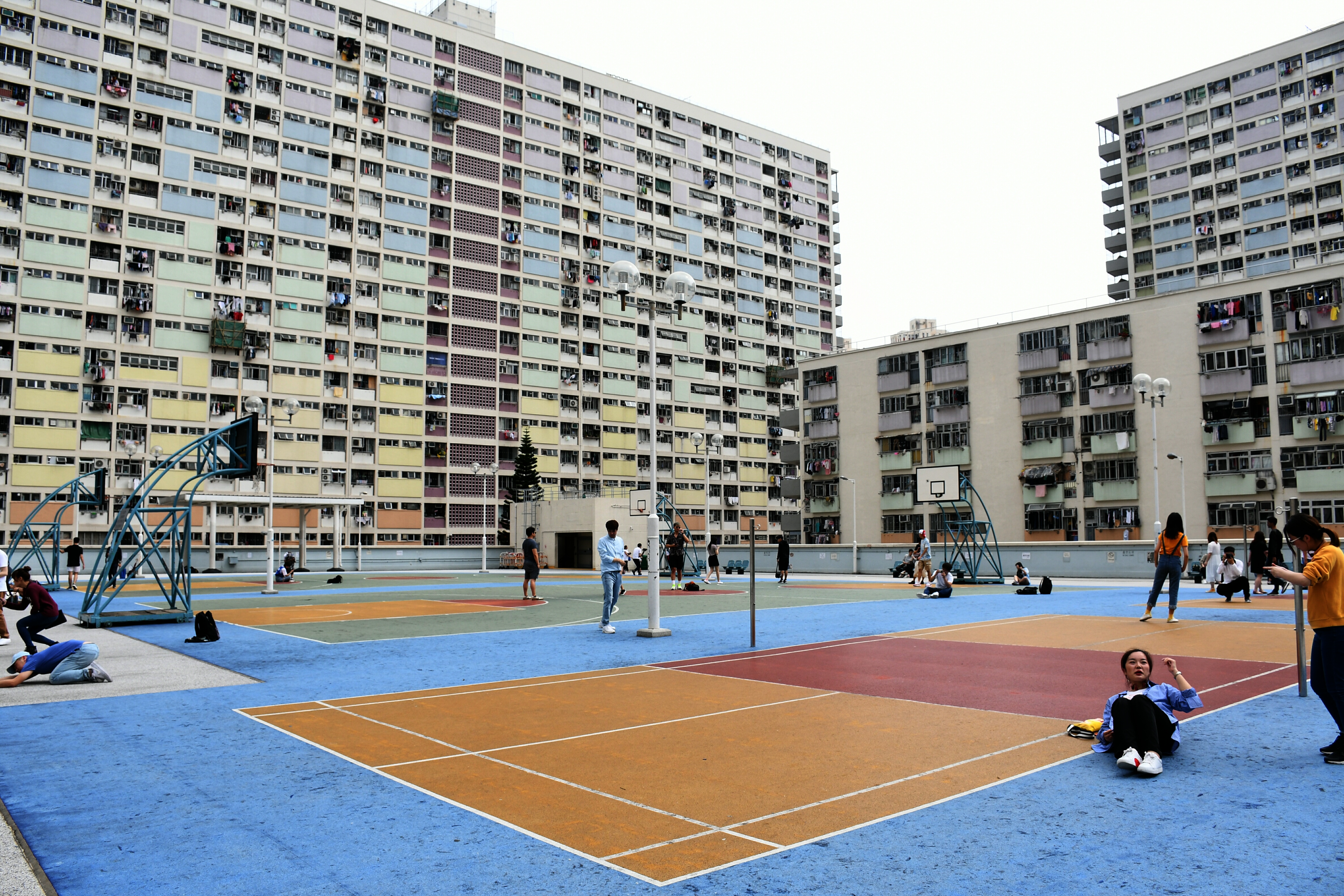 看完樓宇,再看看地面。不同於一般的籃球場,邨內的籃球場用上黃、橙、綠、藍等多款顏色拼接,活力感十足,與外牆相映成趣。