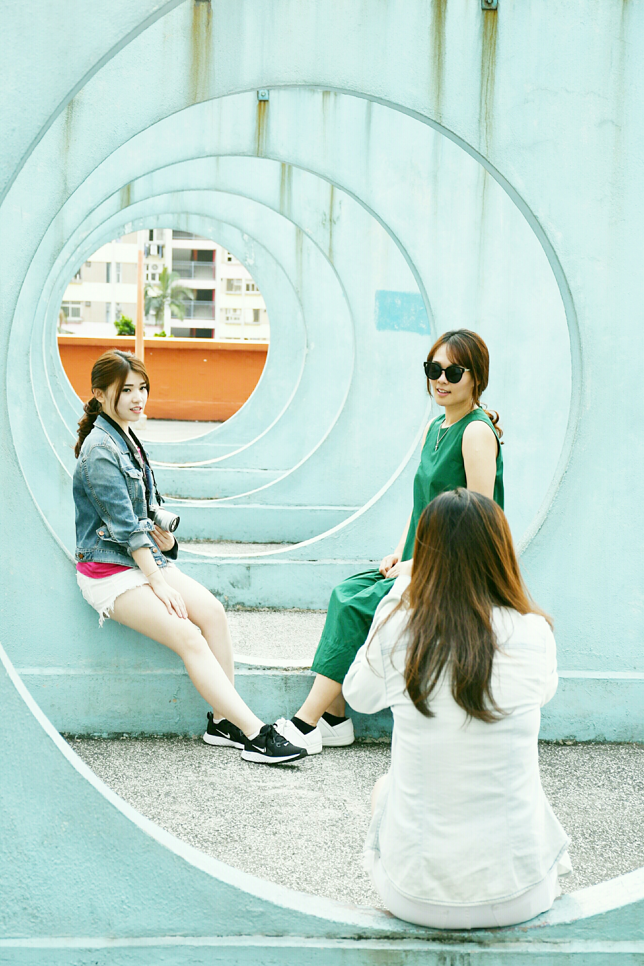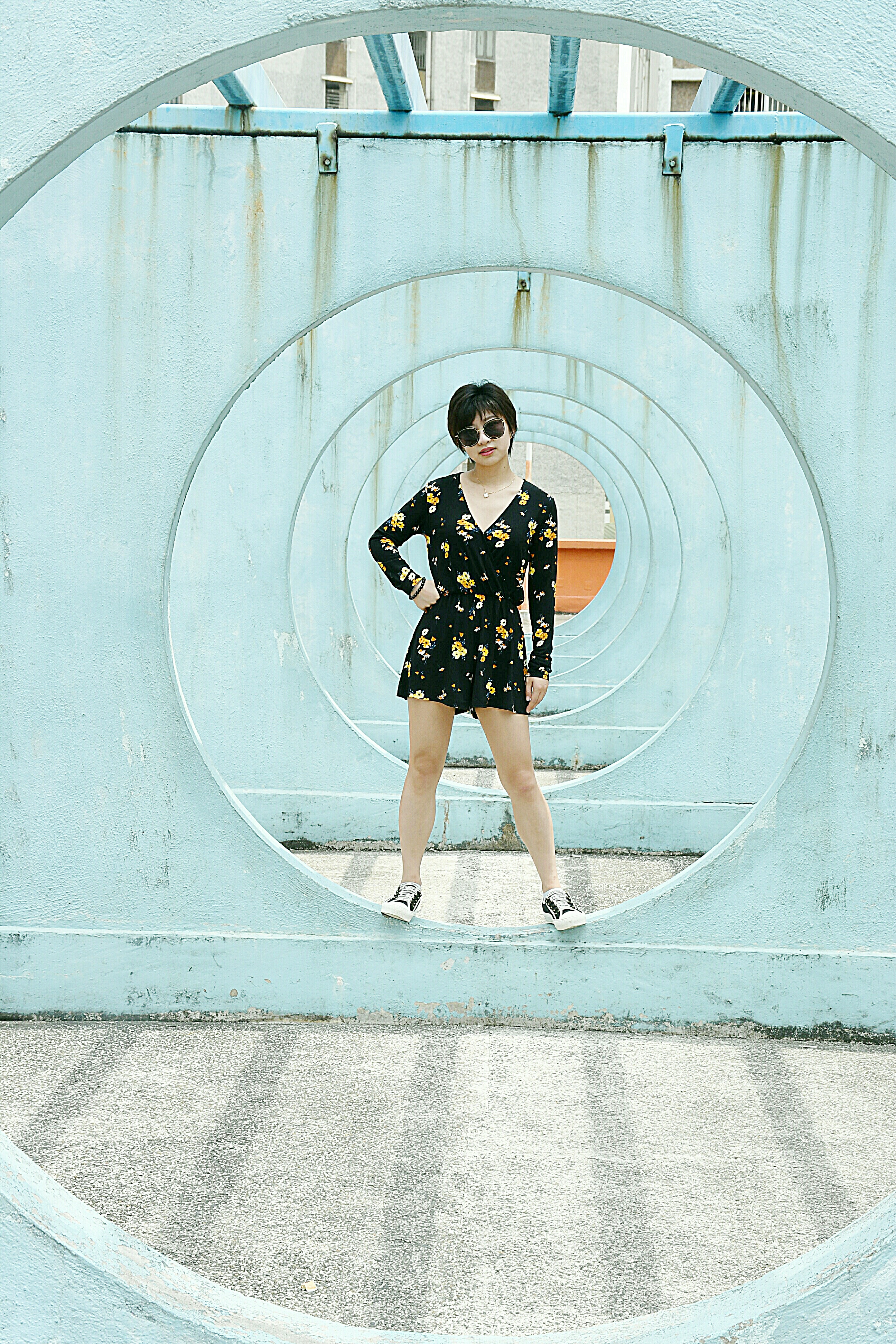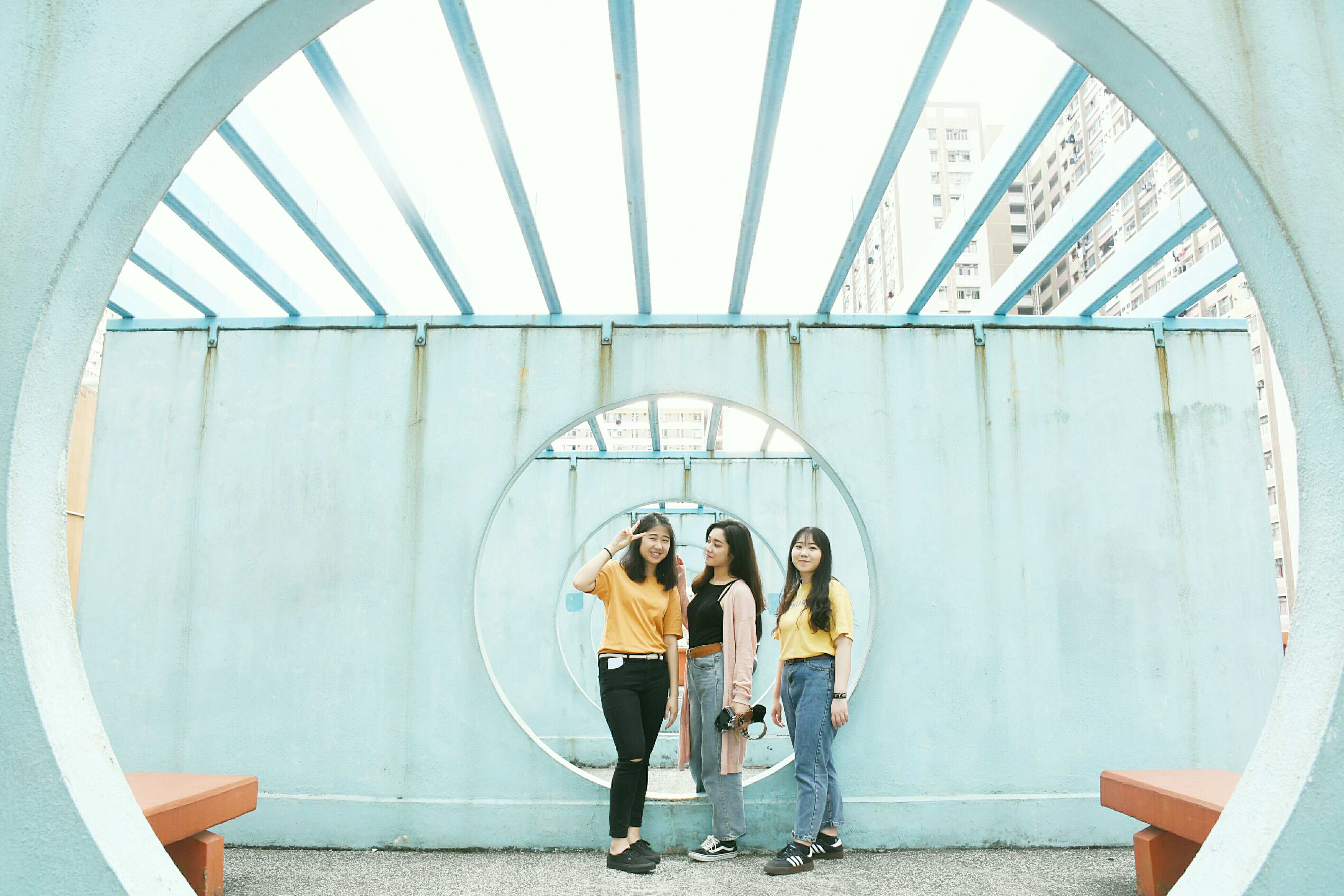 邨內的停車場天台,設有多幅淺藍色的圓形水泥牆,多個圓圈組成猶如一條淺藍色的時光隧道。走進這些淺藍色的圓形中,透過不同角度及圓圈的層次,能令拍攝的畫面簡潔而又別具一格。建議在陽光普照的天氣前往,當陽光照射在水泥牆時,形成的陰影效果是修圖也難以製作。