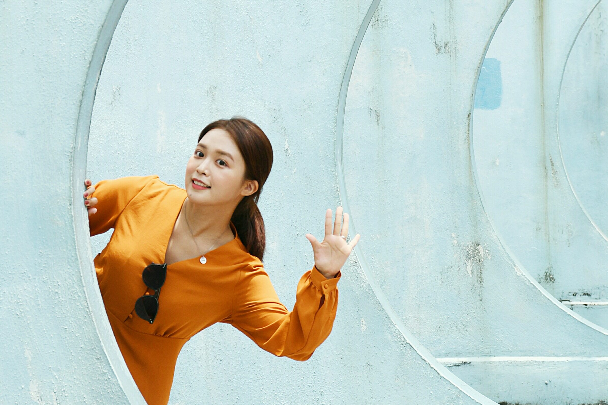由於背景為淺藍色,記者建議可穿着顏色鮮艷的衣服拍攝,產生對比的效果。