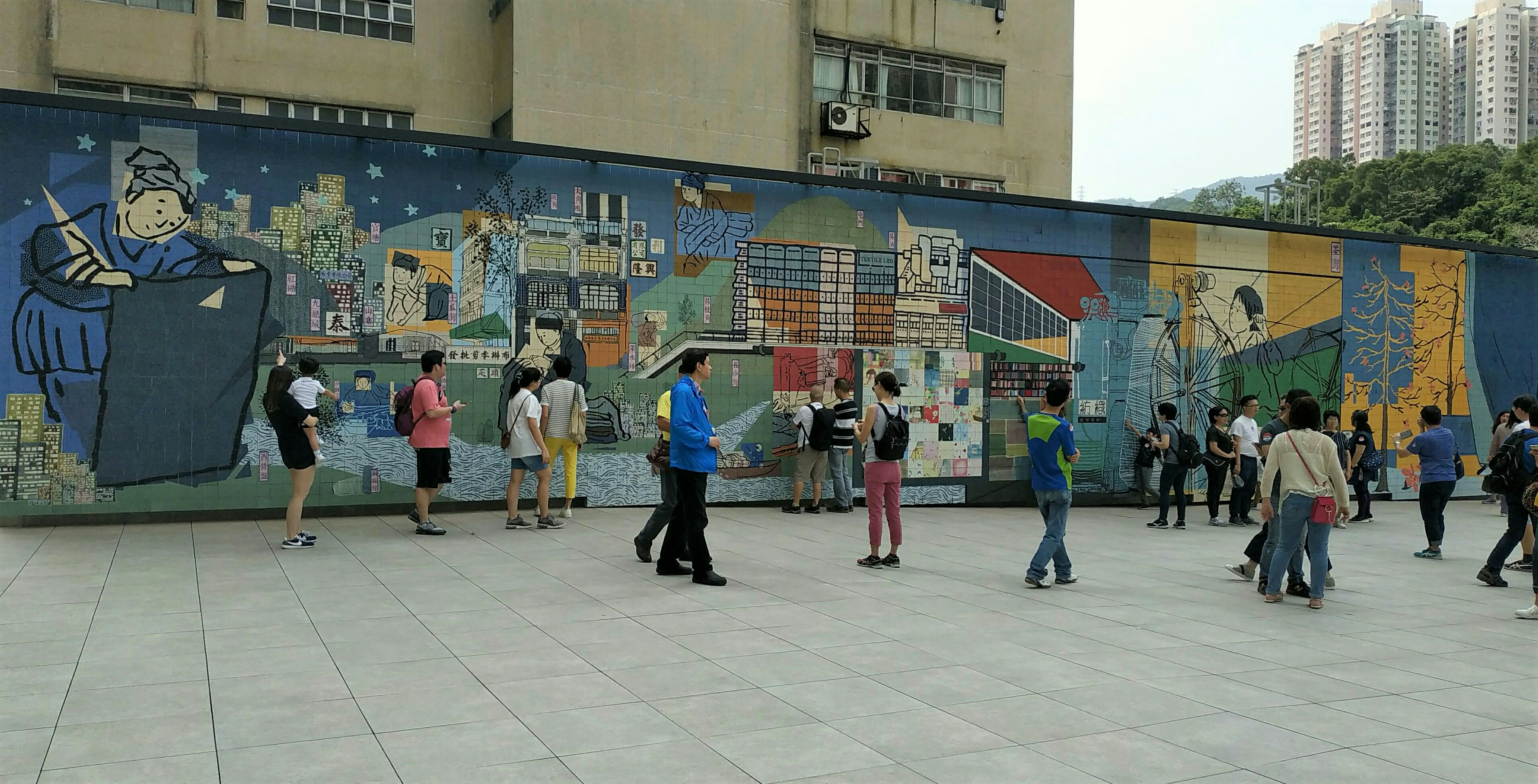 來到籃球場,映入眼簾就是那出「色」的樓宇外牆,七彩的設計讓人心情愉悅,邨內十多幢屋宇幾何交錯,讓屋邨於1965年獲得香港首個建築獎項——香港建築師學會銀牌獎。