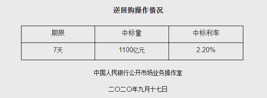 為維護銀行體系流動性合理充裕,2020年9月17日人民銀行以利率招標方式開展了1100億元逆回購操作。
