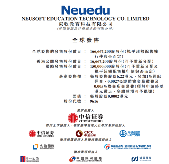 17日,东软教育在港交所公告,公司全球发售16667万股,公开发行1667万股,国际发售1.5亿股,股票代码9616港元。公司9月17日到22日招股,预期9月29日上市。公司最高定价6.22港元,每手800股,入场费5026港元。