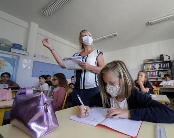 当地时间9月1日,法国尼斯,学生度过暑假後返校上课,老师和学生在室内外均佩戴口罩做好防护措施。(图自中新网)