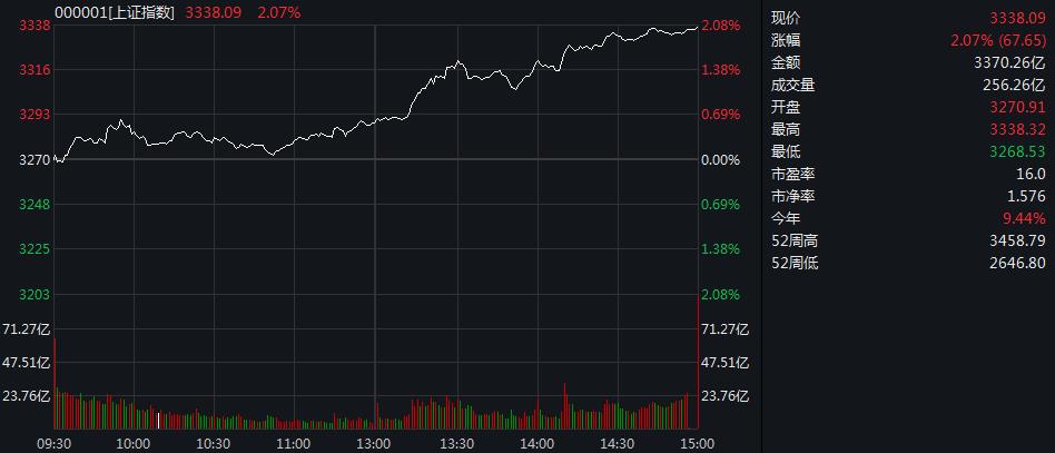 內地股市高收逾1至2%,上證綜合指數以全日最高位收市,收報3338點,升67點,升幅2%,深證成份指數收報13245點,升229點,升幅1.7%,兩市成交額8356億元人民幣,北向資金淨流入94.7億人民幣,創業板指數高收1.5%。富時羅素指數變動將於今日收市後生效,部分北向資金因而強制買入涉及的150支個股。