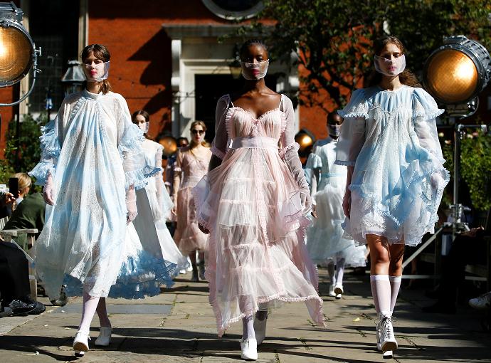 當地時間9月18日,2020年倫敦時裝周啟幕,模特們在時裝週上展示以「防疫 」為主題的時裝作品。 (圖源:路透社)