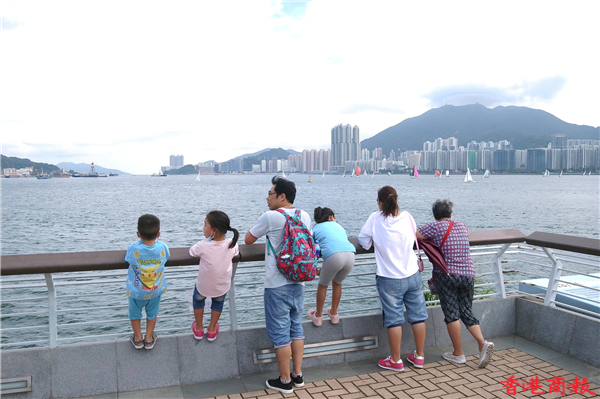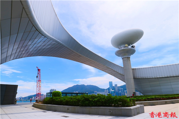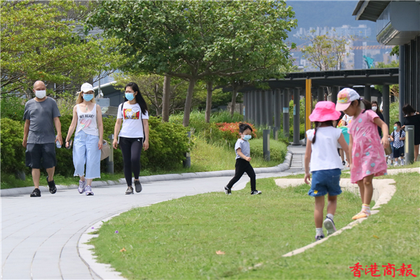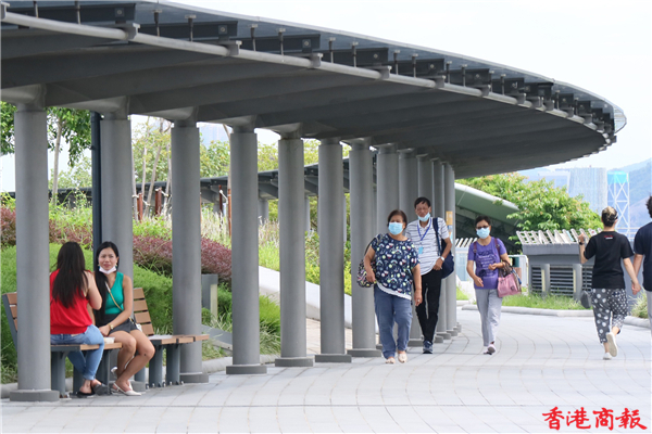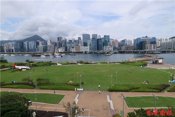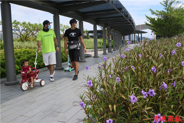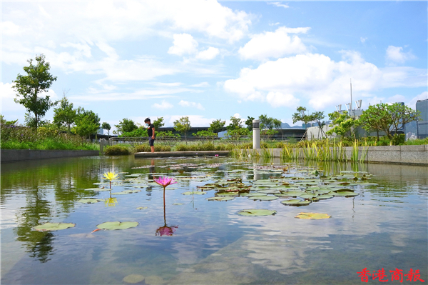 在郵輪碼頭天台的公園以「山、城、水」為設計概念,利用螺旋狀及縱橫交錯的人行通道,創造有趣味的行人體驗。植物花園內的「水園」展示荷花,又有地形奇趣的兒童綠洲和嬉水廣場,而面向維多利亞港一方的觀景平台,讓遊人可飽覽維多利亞港的景致。(記者馮瀚文 攝)