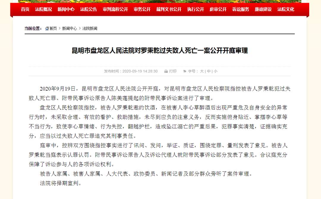 9月19日,云南省昆明市盘龙区人民法院公开开庭,对昆明市盘龙区人民检察院指控被告人罗秉乾犯过失致人死亡罪、附带民事诉讼原告人陈美莲提起的附带民事诉讼案进行了审理。