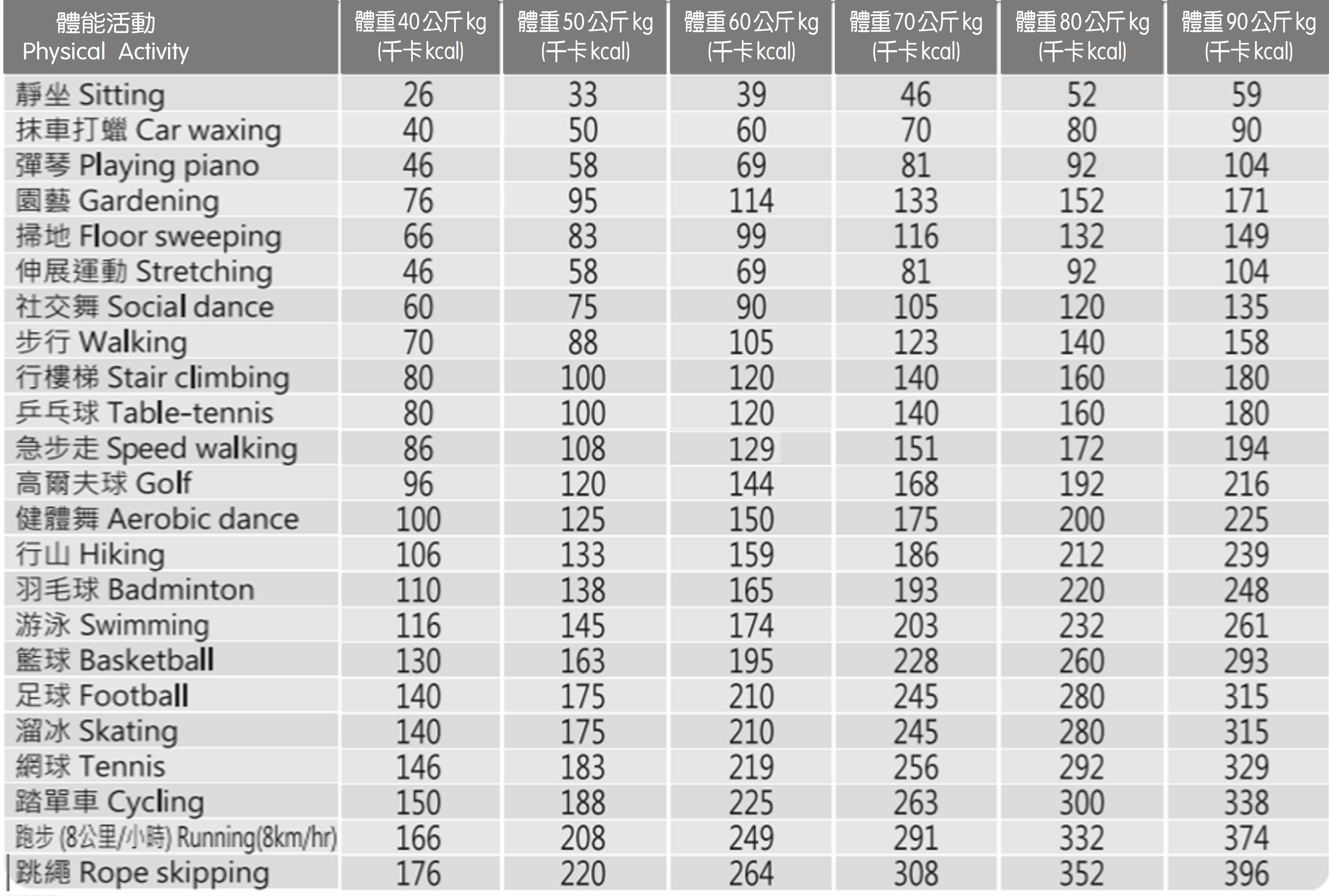 註:實際消耗的熱量同時取決於運動的劇烈程度和時間長短,以及個人體能、技術水平、性別、年齡等因素。