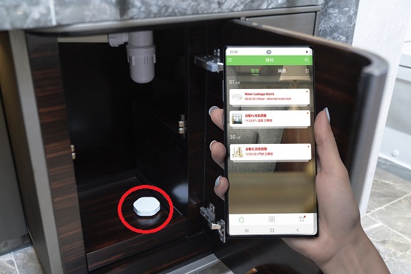 開啟智能漏水感應器後(紅圈),當偵測到有滲水情形,系統會透過手機應用程式即時向用戶傳送安全提示。