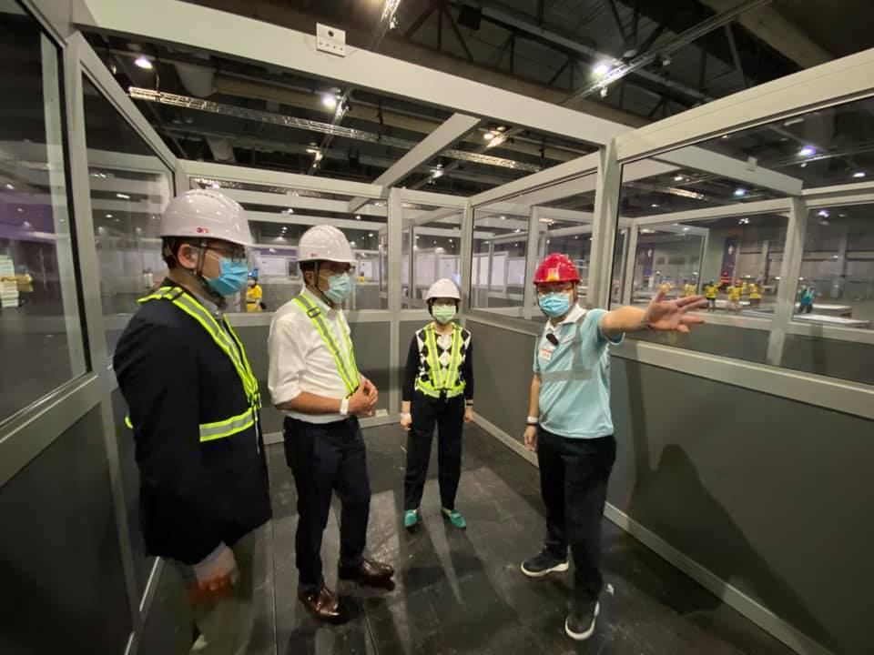 食衛局局長陳肇始(右二)、醫管局行政總裁高拔陞(左一)、發展局局長黃偉綸(左二)昨視察亞博館內增建社區治療設施的開工情況。發展局fb 圖片