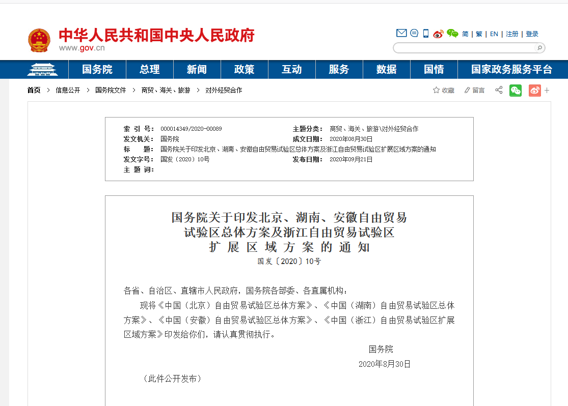据中新网消息,9月21日,国务院印发北京、湖南、安徽自由贸易试验区总体方案及浙江自由贸易试验区扩展区域方案的通知。