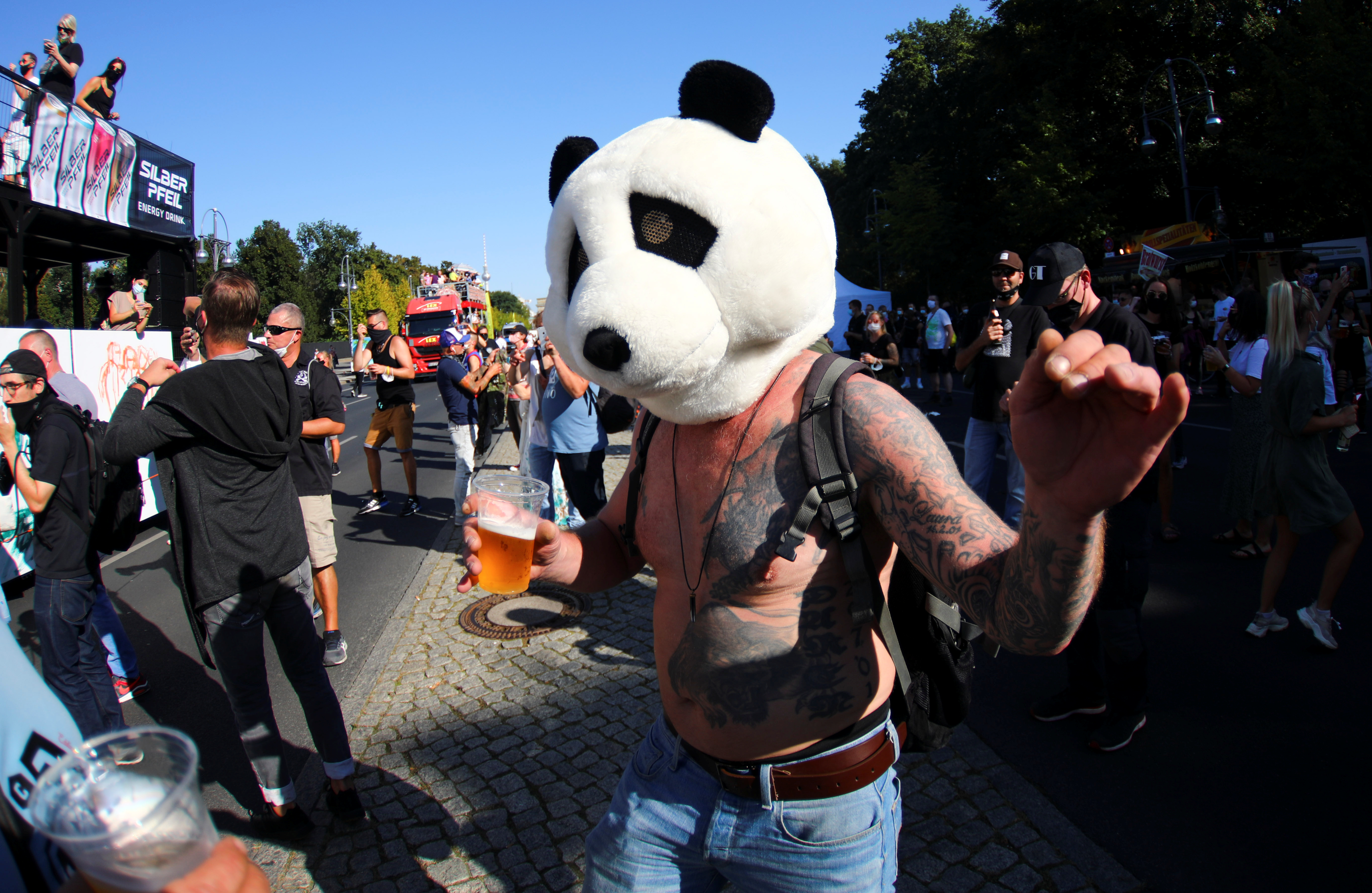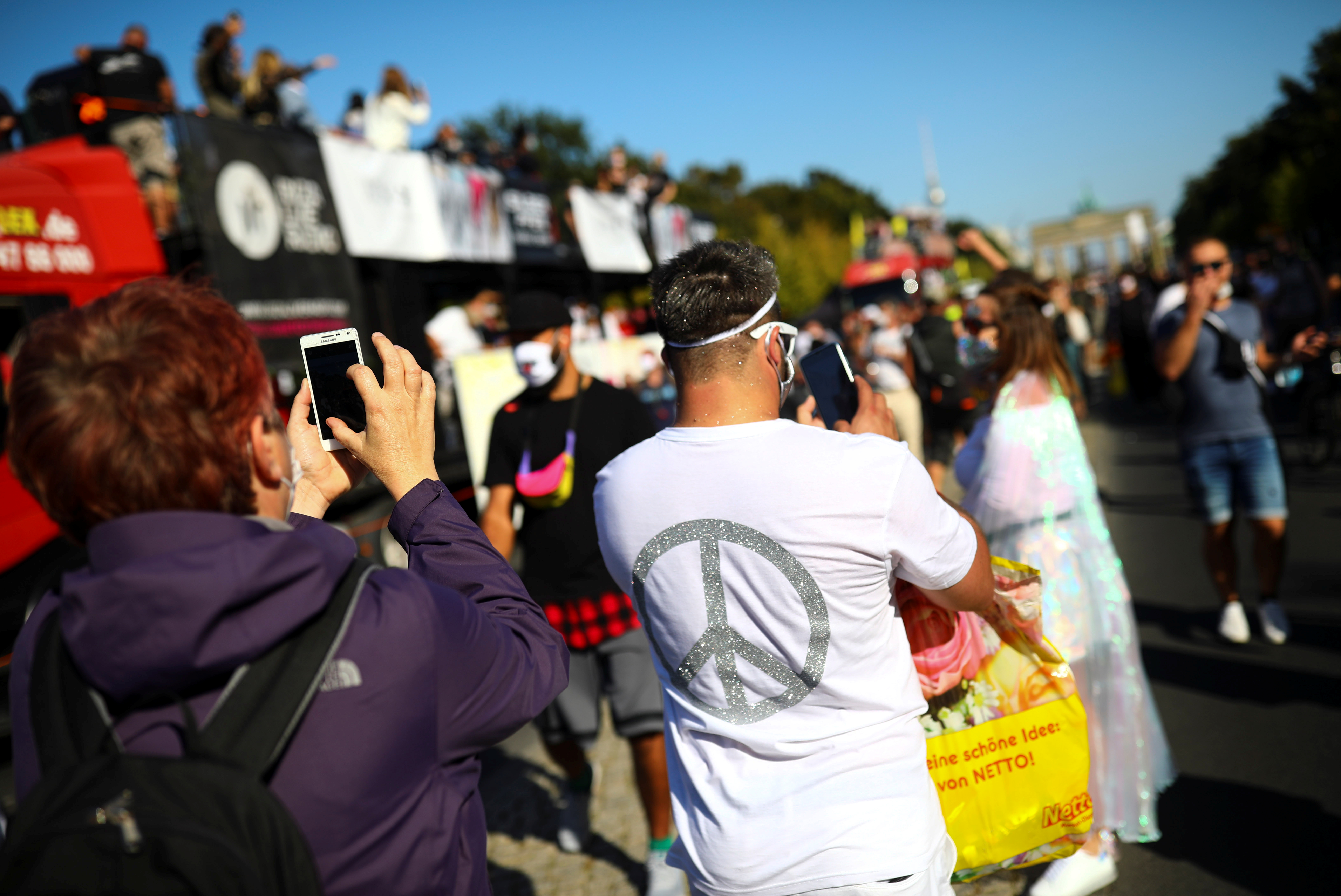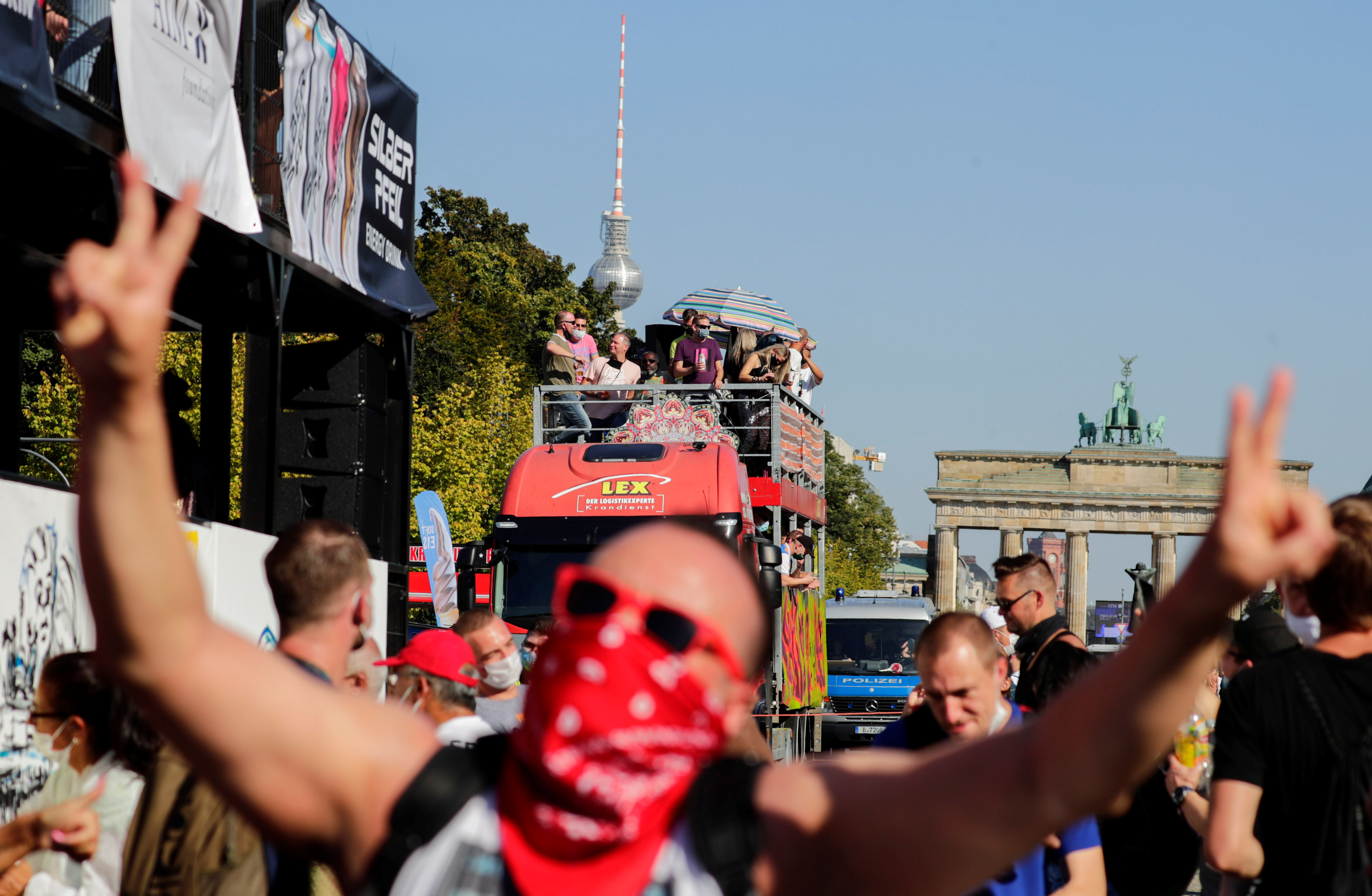 在德國柏林疫情爆发期間,人們在世界和平日當天(9月21日),參加從勃蘭登堡門到勝利柱的「愛世界和平大遊行」 。