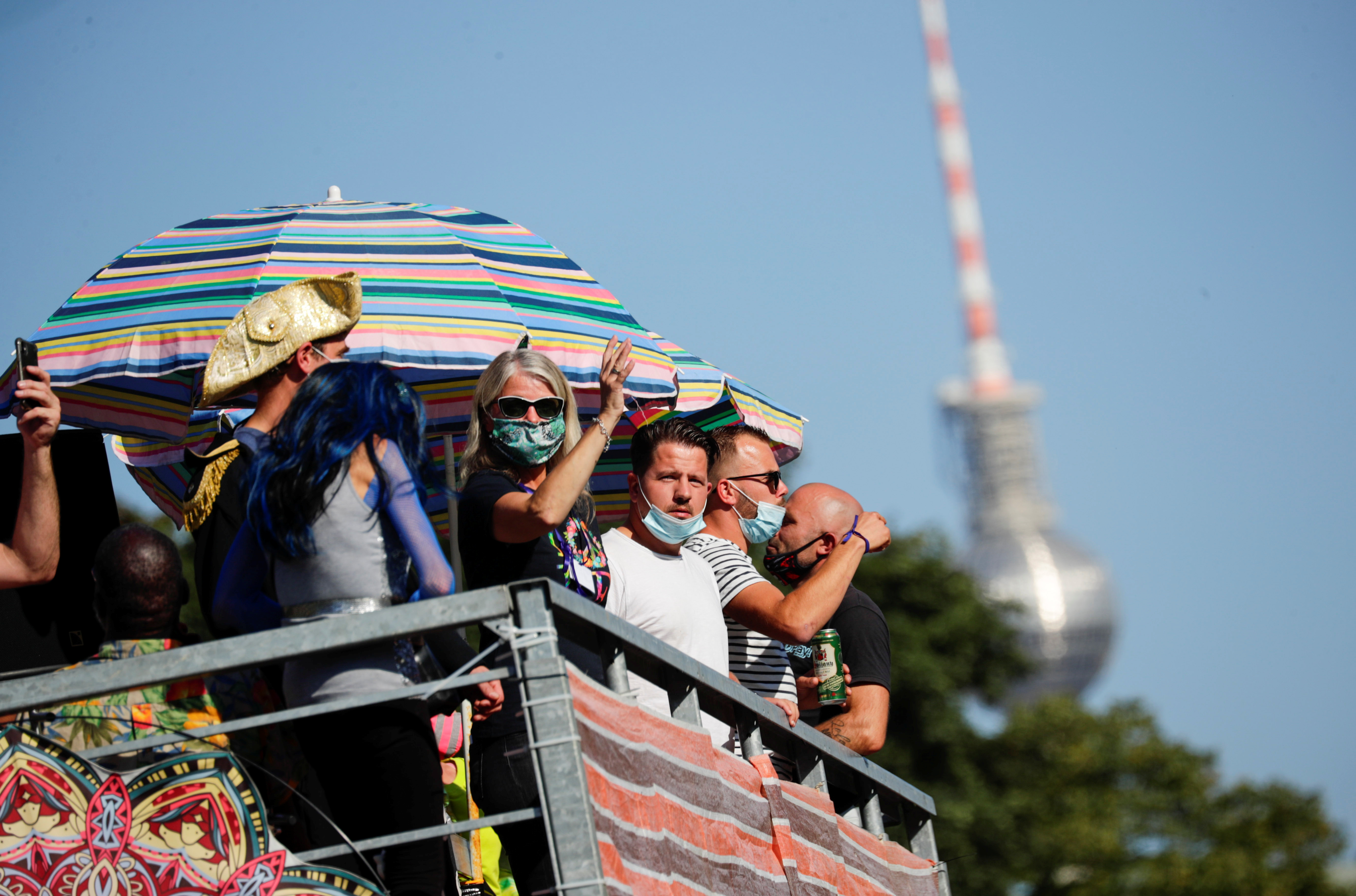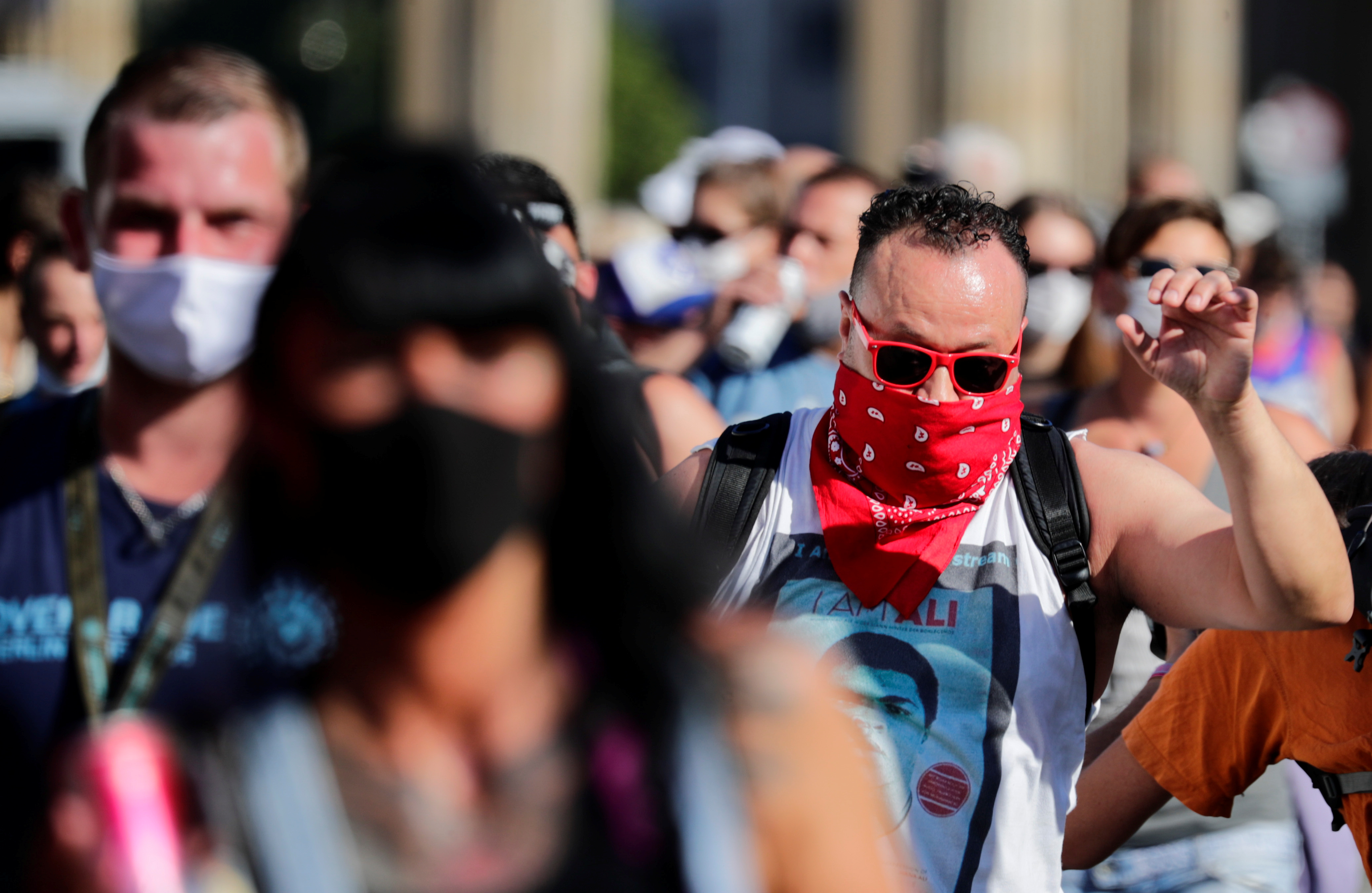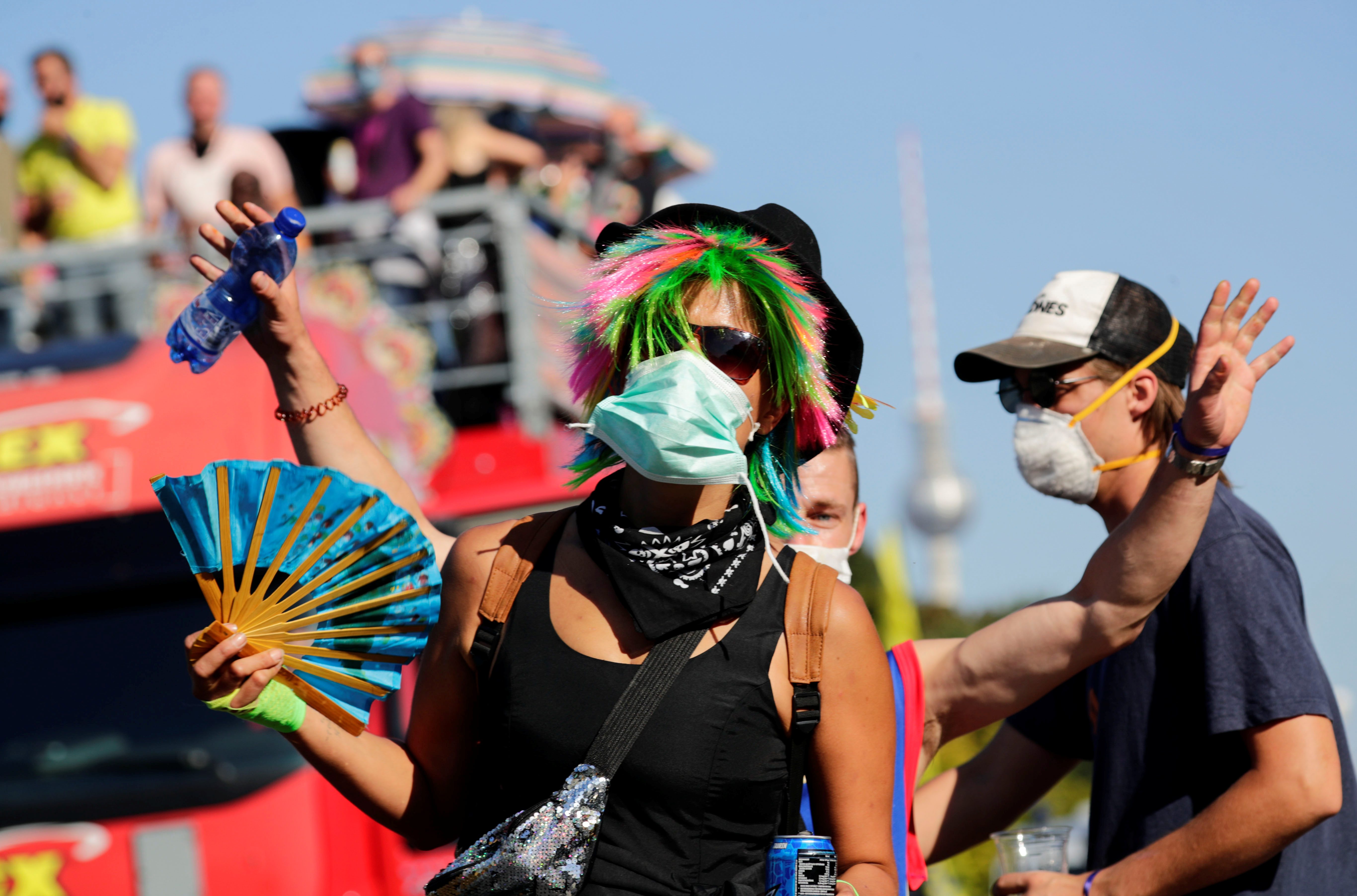 在德國柏林疫情爆发期間,人們在世界和平日當天(9月21日),參加從勃蘭登堡門到勝利柱的「愛世界和平大遊行」 。