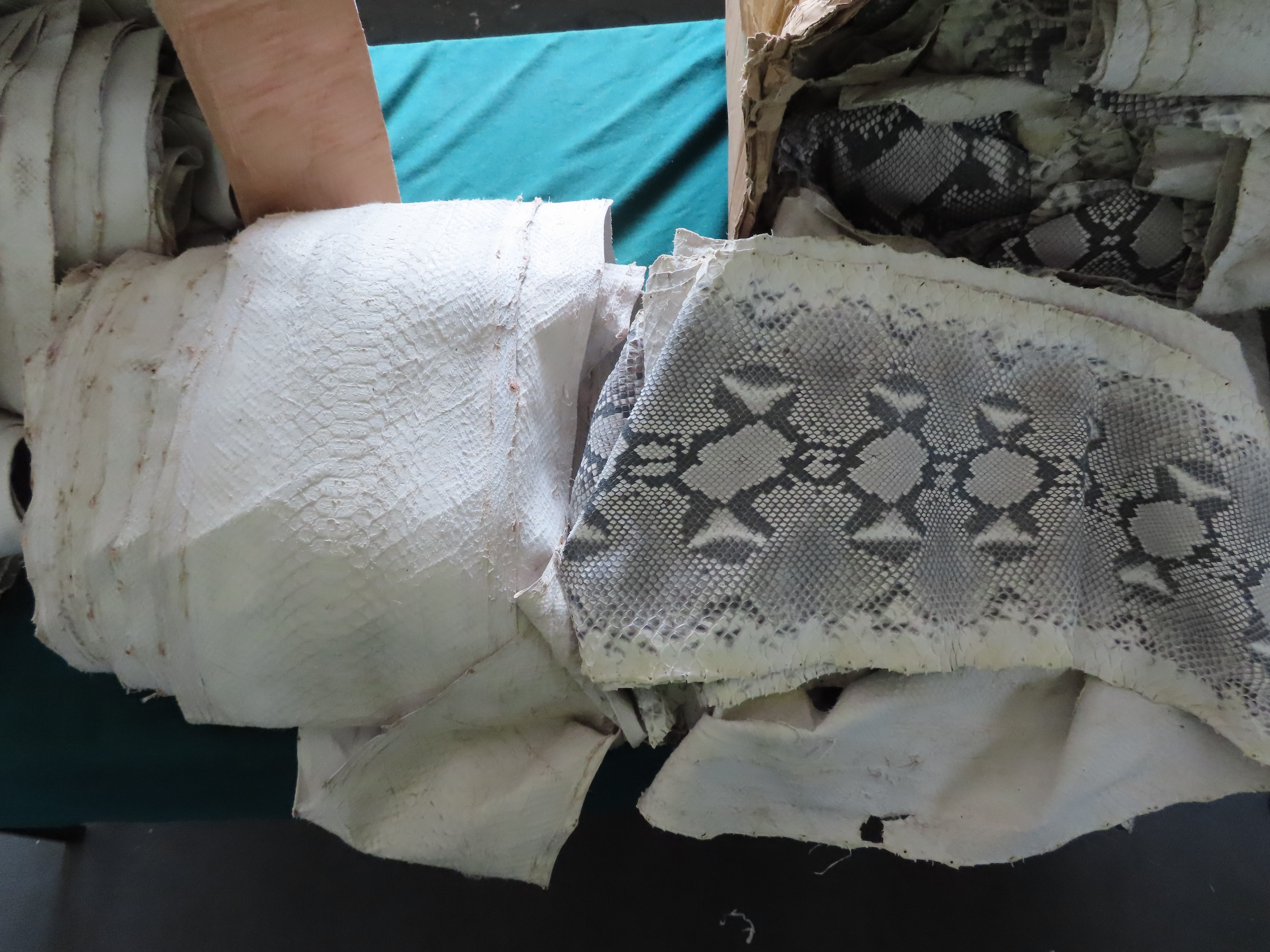香港海關九月十七日在落馬洲管制站破獲一宗走私案件,檢獲一百四十八塊屬瀕危物種蛇皮,估計市值約七十四萬。圖示檢獲的走私屬瀕危物種蛇皮。