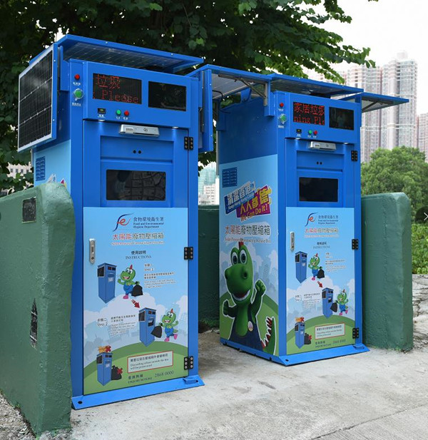 食環署今日(22日)宣布開展第三代太陽能廢物壓縮箱試驗計劃,分兩批在9個分區的鄉郊民居安裝共24個壓縮箱,為期1年,冀壓縮箱可改善因垃圾桶滿載引致的胡亂棄置家居垃圾情況,減輕由亂拋垃圾引致的鼠患及蟲害等問題。