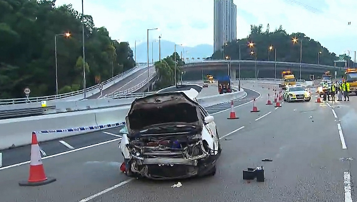 警方到場封閉3條行車線進行調查,肇事私家車嚴重撞毀,車頭泵把飛脫,零件散落一地,現場遺下約100米煞車胎痕及血漬,以及男司機的波鞋。警員同時發現在司機位的安全帶扣位置,插有1個俗稱「靜音扣」的安全帶插片。現場消息稱,男司機與女友人早前在大角咀與朋友消遣,其後由男司機接載女友人回沙田寓所,途中女友人入睡,直至意外發生時才驚醒。
