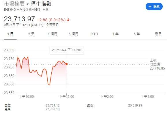恆指今日低開15點,報23701,半日收報23713.97點,跌2.88點或0.01%,主板成交額557.3億元。國指跌0.16%報9561點。