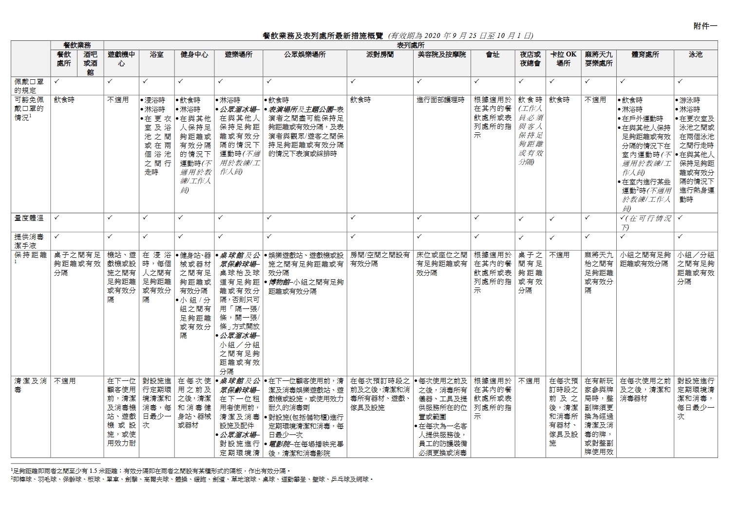 食物及衛生局發言人表示,因應疫情持續放緩,已於過去4星期以有系統的方式逐步和有序地分階段放寬社交距離措施,包括放寬在公眾場所進行羣組聚集的人數限制、延長餐飲業務處所的堂食時間和放寬可同坐一桌的人數限制,以及重開所有餐飲業務及表列處所。考慮到最新的公共衛生風險評估,由本星期五(25日)起,除稍為調整有關桌球館、公眾保齡球場及淋浴設施的開放安排外,政府會維持其他適用於餐飲業務處所及表列處所的限制。此外,由10月1日起,部分公眾娛樂場所可在根據最新規定及限制,並採取充足防疫措施的情況下,恢復有現場觀眾的表演。