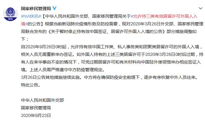 据国家移民管理局通知,中华人民共和国外交部、国家移民管理局发布关于允许持三类有效居留许可外国人入境的公告:自2020年9月28日0时起,允许持有效中国工作类、私人事务类和团聚类居留许可的外国人入境,相关人员无需重新申办签证。如外国人持有的上述三类居留许可于2020年3月28日0时后过期,持有人在来华事由不变的情况下,可凭过期居留许可和有关材料向中国驻外使领馆申办相应签证入境。