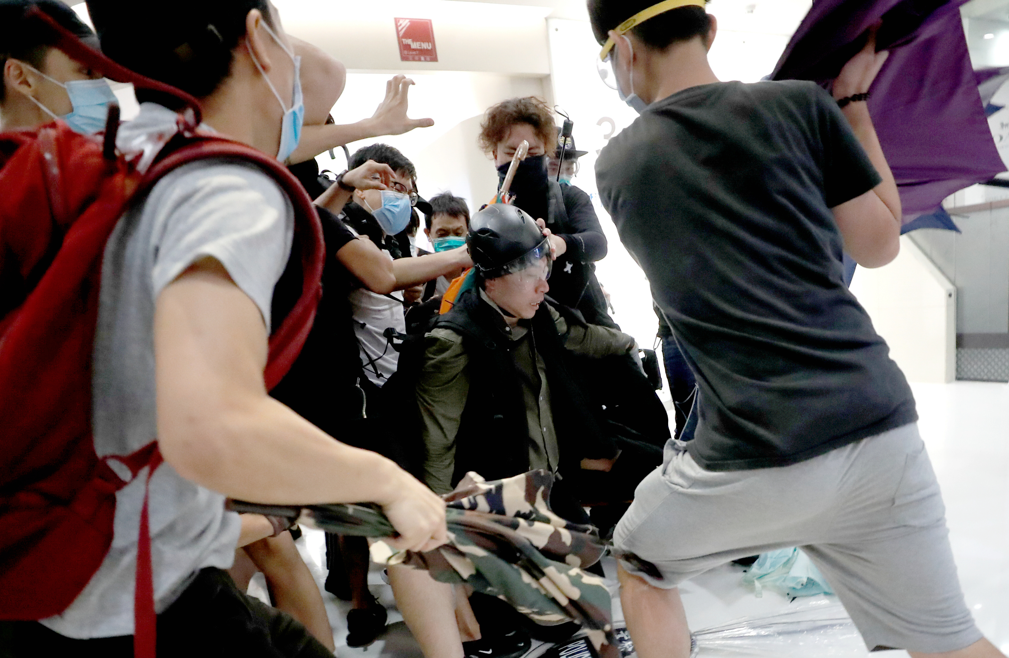 一班「示威者」在新城市廣場襲擊一名警員。資料圖片
