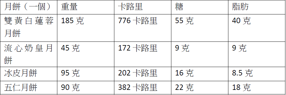 除了傳統蓮蓉月餅、五仁月餅,近年流行流心奶皇月餅、冰皮月餅等選擇,不論選購哪款月餅,都應該看清盒上的營養標籤,注意脂肪、糖分和熱量含量,以免攝取過量,損害健康。在眾多月餅之中,以雙黃白蓮蓉月餅的卡路里最高,一個已達800卡路里,即約3碗半飯的熱量,註冊營養師梁嘉文表示:「傳統蓮蓉月餅外皮以豬油搓揉,豬油屬於飽和脂肪,蓮蓉也會加入大量糖及油去炒,當中有8茶匙的油及11茶匙的糖,進食過量會增加血液中的壞膽固醇,引起心血管疾病,建議每次進食少於四分之一個。」除了攝入過多卡路里,過多的糖分也不利健康。世界衛生組織建議,每日糖分攝取量應在25克或以下,四分之一件傳統月餅(約50克)已有約15克糖,已佔攝取限制量的六成。