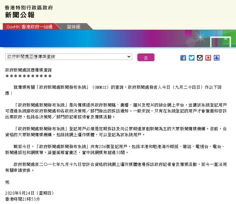 發言人指,「政府新聞處新聞發布系統」登記用戶必須是定期採訪及向公眾報道原創新聞為主的大眾新聞傳媒機構。目前,合資格的大眾新聞傳媒機構,包括純網上運作媒體,可以登記為該系統用戶。一般來說,只有在系統登記的用戶才會獲邀和容許出席政府,包括各決策局/部門的記者招待會及傳媒活動。