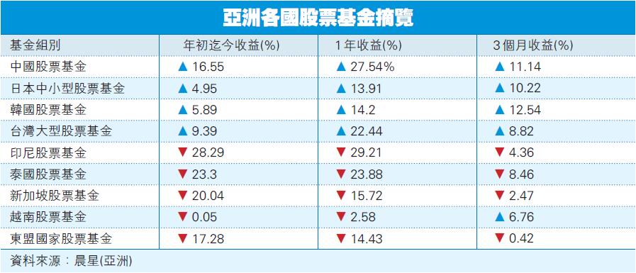 晨星(亞洲)數據顯示,台灣大型股票基金、韓國股票基金及日本中小型股票基金,過去一年分別升22.44%、14.2%和13.91%。為何亞洲股票基金也表現強勁?龐寶林表示,短期有很多問題發生,包括中美貿易戰、美國大選等,令亞洲成為資金的避風塘,惟亞洲股票基金已經累升了差不多。