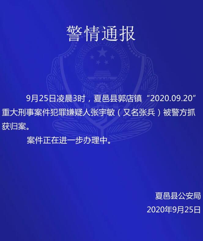 中新网9月25日电 河南省商丘市夏邑县公安局微信公众号25日通报,9月25日凌晨3时,夏邑县郭店镇「2020.09.20」重大刑事案件犯罪嫌疑人张宇敏(又名张兵)被警方抓获归案。
