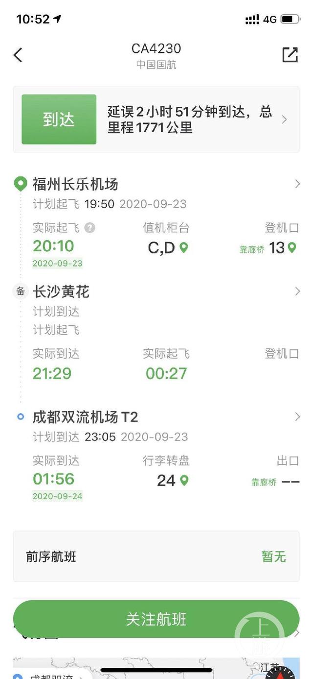 据中国国际航空官方数据显示,9月23日的国航CA4230航班晚间8点10分从福州长乐国际机场起飞,晚间9点29分备降长沙黄花机场,9月24日凌晨0点27分再次从长沙机场起飞,并於凌晨1点57分在原定目的地成都双流机场落地。民航信息系统的数据显示,CA4230航班20点36分开始平飞之後,21点14分开始从7025米的巡航高度下降,并於21点29分计划外备降长沙机场。