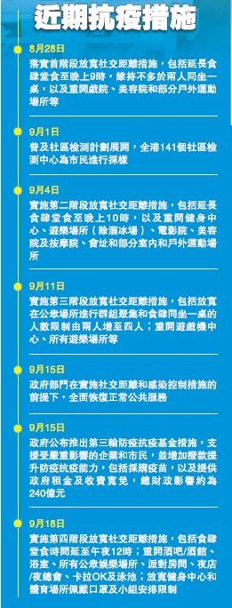 林鄭談到,過去一個月的其中一項重要抗疫舉措,是在9月1日至14日進行普及社區檢測計劃。這項由中央政府支援特區進行的計劃,為市民提供「願檢盡檢」的病毒檢測服務,旨在更好掌握整體社區的感染情況,以及找出社區內無病徵的隱性患者,切斷社區傳播鏈。普及社區檢測計劃的規模之大,籌備時間之短,對特區政府來說是前所未有,能順利推行,並有超過178萬名市民參與,實在感恩,亦要感謝參與檢測的每一位市民、檢測中心和實驗室的工作人員、負責物流和保安的人員,以及其他統籌及支援的政府內部同事;中央政府的支持及相關部委的配合,以至接近600位來自廣東、福建和廣西的內地核酸檢測支援隊成員的無私奉獻,更是計劃成功的關鍵。計劃除了達致上述的政策目的外,亦讓普羅大眾更了解病毒檢測過程,提升他們的防疫意識,並在短時間內建立了一個有數千名受過訓練和有實戰經驗的採樣人員的網絡,可供日後動員之用。