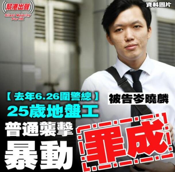 一名26歲地盤工被控去年6月26日包圍警總期間,襲擊一名便衣警員,早前裁定暴動、普通襲擊、及無依期歸押罪成,下午在區域法院判監4年。