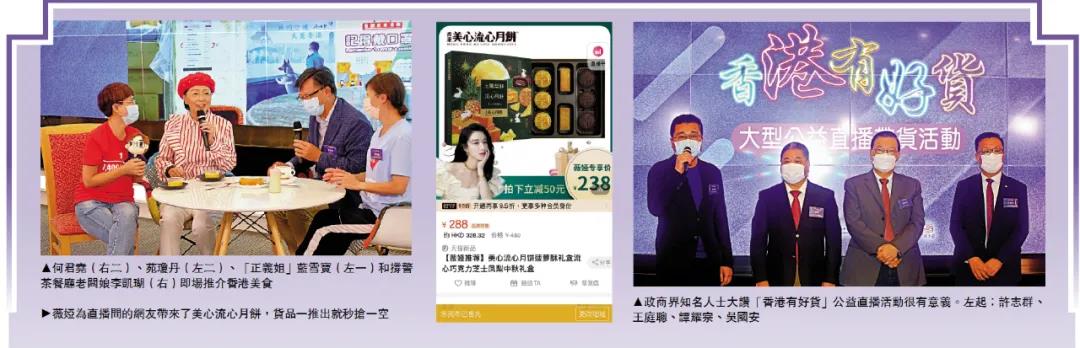 由香港大公文匯傳媒集團主辦的香港首次大型公益直播帶貨活動「香港有好貨」昨晚正式開播。「淘寶第一主播」薇婭、「石榴姐」苑瓊丹、TVB演員曹永廉、神秘嘉賓鍾欣潼(阿嬌)和惠英紅,以及政商界名人與愛國KOL,線上線下為美心、四洲、李錦記、萬寧等優質港貨傾力助陣。薇婭直播香港專場的在線人數逾570萬人,活動中,6000盒流心月餅和2萬份面膜等多款商品一上架就被直接「秒空」。