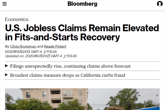 彭博社分析稱,申請失業救濟的美國人數量仍然居高不下,表明勞動力市場復甦艱難。在前一周的報告中,首次申請失業救濟人數有所下降,但本周數據再度上升,顯示一些企業加強招聘,另一些企業則在裁員,數據因此漲跌不一。由於企業在沒有政府額外刺激措施的情況下難以維持生計,數以百萬計的美國人仍然失業或面臨失業風險。