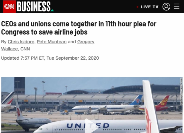 CNN報道,首席執行官和工會領袖聯合請求國會拯救航空公司的工作崗位。