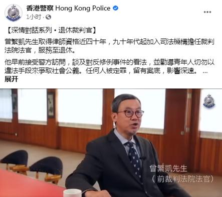 香港警方Facebook平台今日(26日)分享對話退休裁判官曾繁凱的視頻。曾繁凱取得律師資格近四十年,九十年代起他加入司法機構擔任裁判法院法官,服務至退休。他接受警方訪問,表達對反修例事件的看法,並勸導青年人切勿以違法手段來爭取社會公義。任何人被定罪,留有案底,影響深遠。