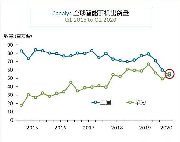 2020年第二季度,華為首次超越三星奪得全球智能手機出貨量冠軍。