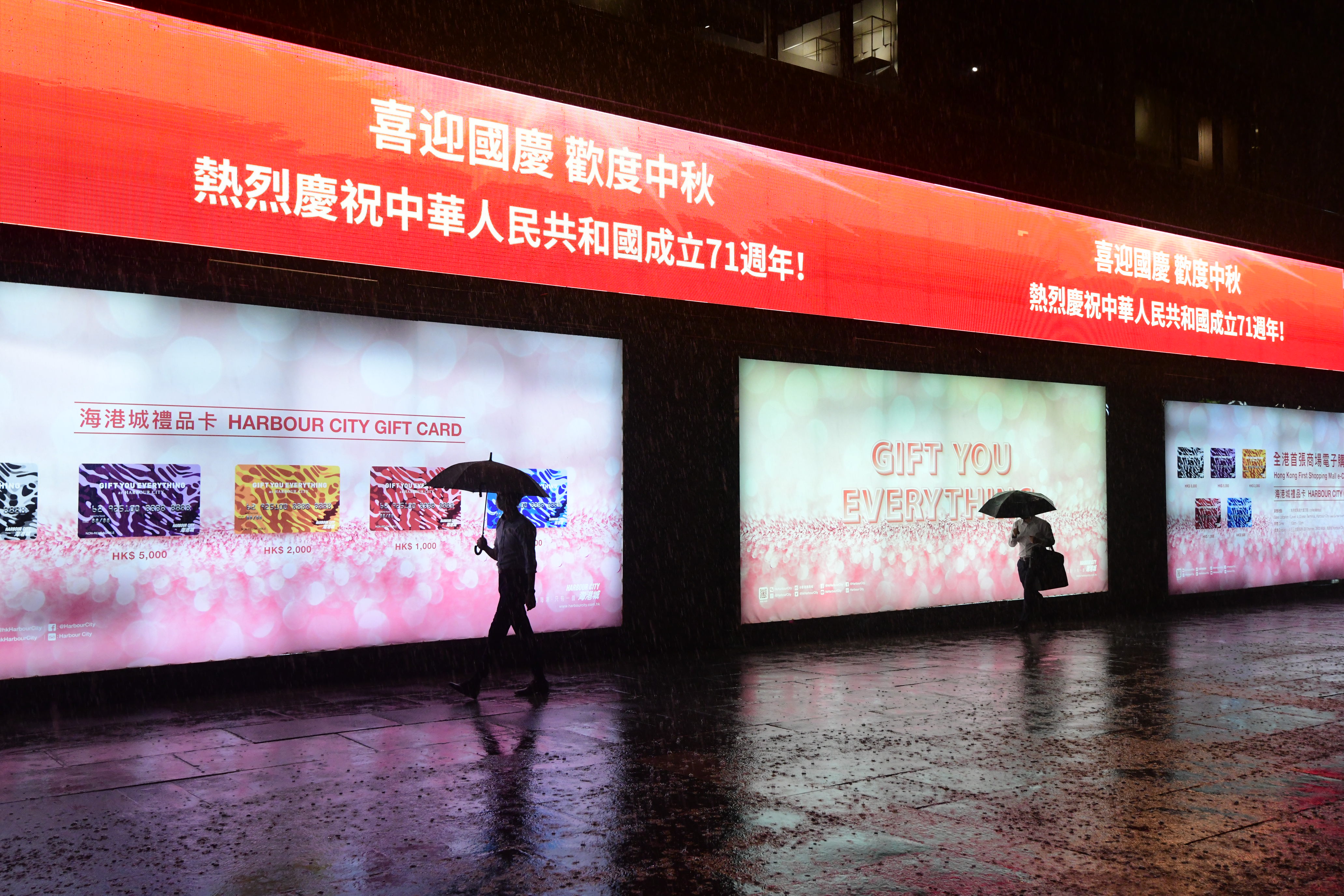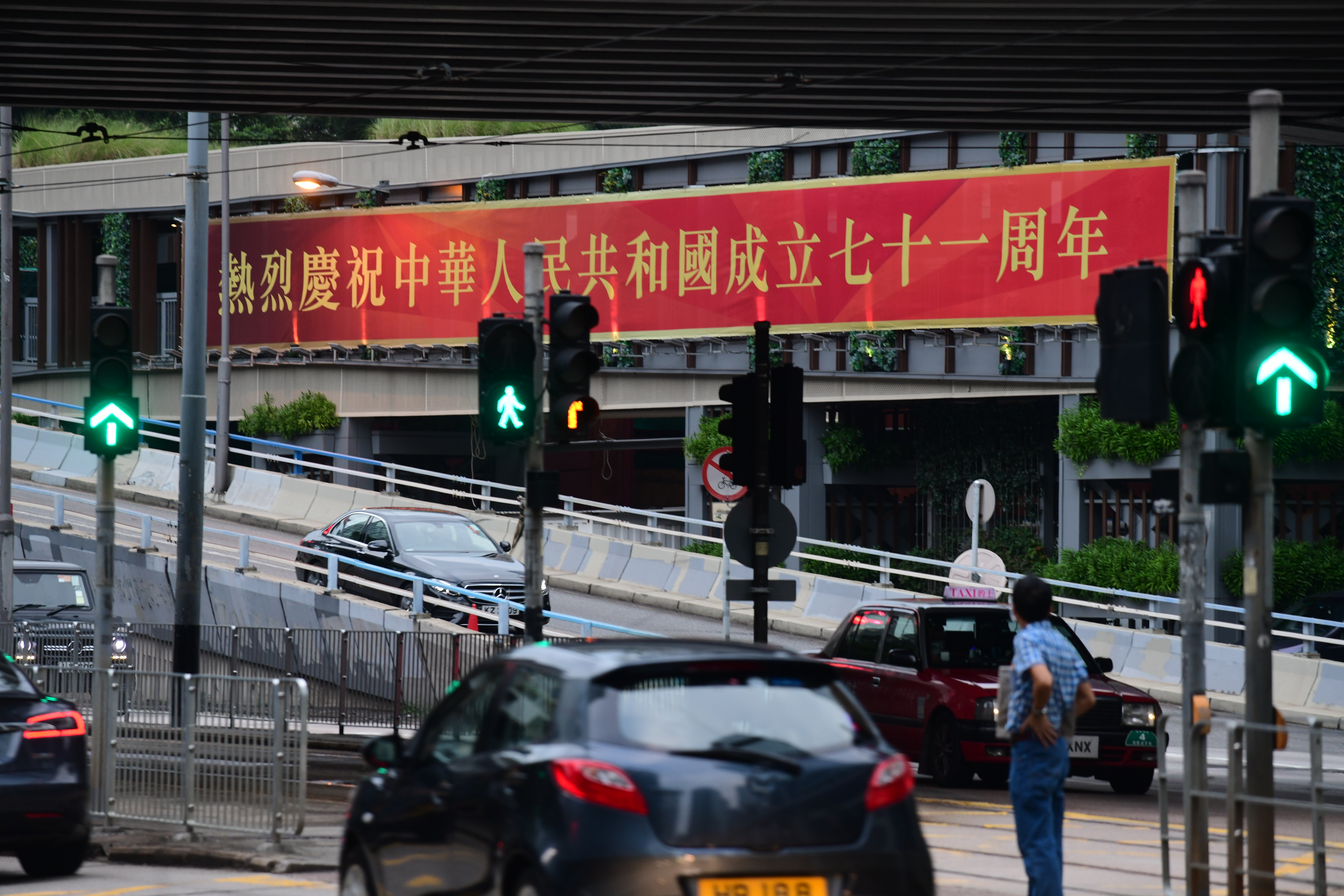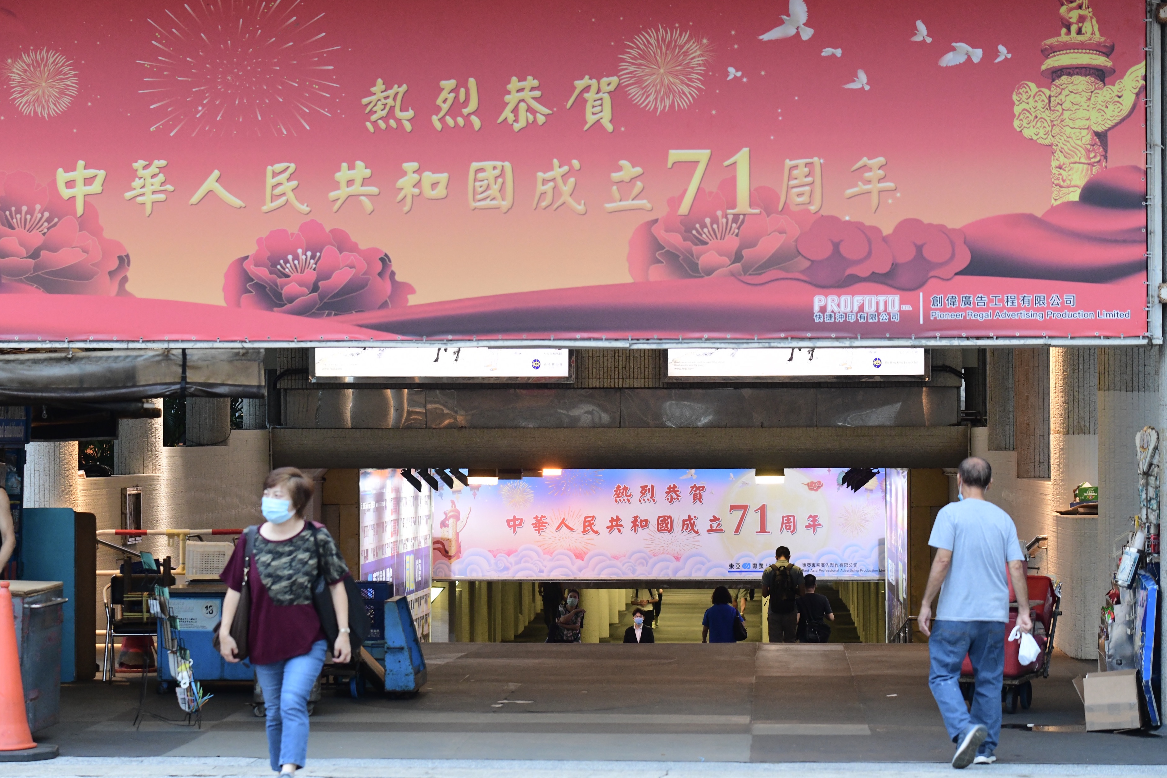 國慶節和中秋節将至,今日(30号)本港大街小巷即已装点上各式横幅,营造出浓浓的节日气氛。(摄影 崔俊良 郑玉君 罗璇)