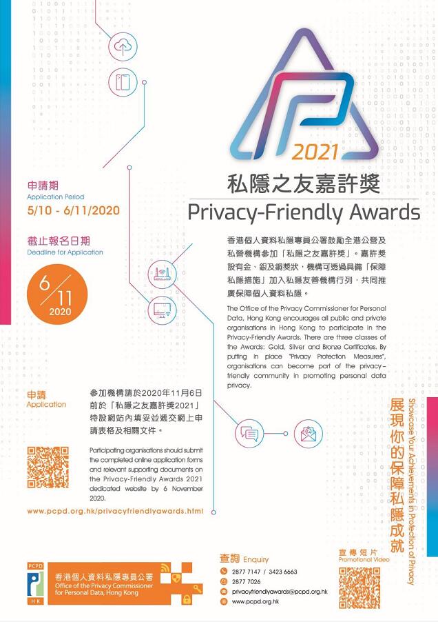 香港個人資料私隱專員公署為回應公眾對保障個人資料私隱的期望,今年第一次舉辦「私隱之友嘉許獎2021」。參加機構可於今日(5日)至11月6日或之前遞交網上申請表格及所需資料,得獎名單於2021年1月底前公布。