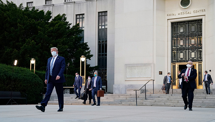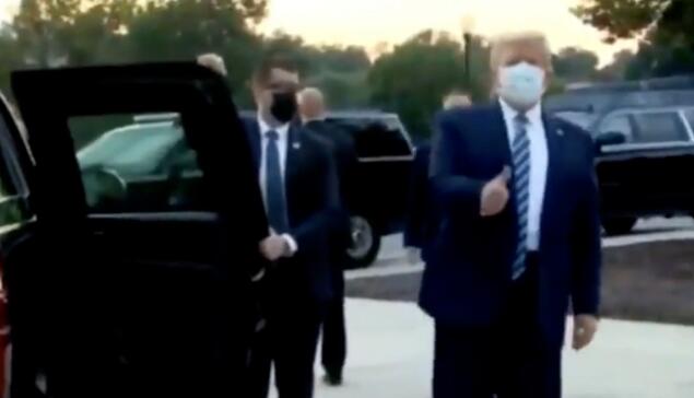 據CNN報道,美东时间5日傍晚18时38分,特朗普握着拳头從沃爾特•里德國家軍事醫療中心的前門走出來。他穿着西裝,戴着口罩,走下台階。特朗普在上車前向媒體揮手,並說:「非常感謝」,还竖起大拇指。其後特朗普乘坐直升機返回白宮。期間,他沒有回應記者的提問。