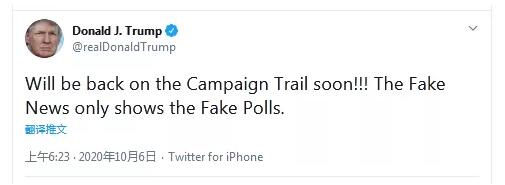 在走出医疗中心前十几分钟,特朗普发推称,「很快将投入到竞选活动中去!假新闻只展示假民调。」