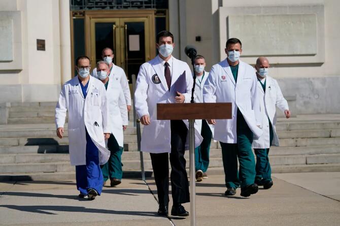 由白宫医生肖恩·康利(Sean Conley)领导的医疗团队在沃尔特·里德医疗中心召开发布会