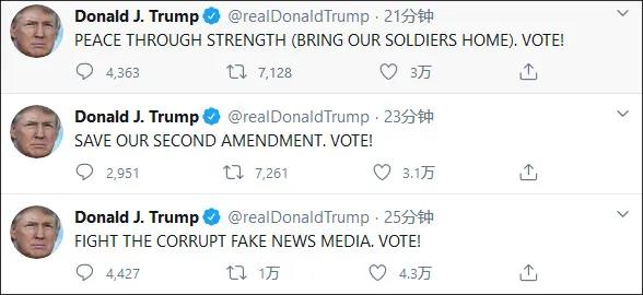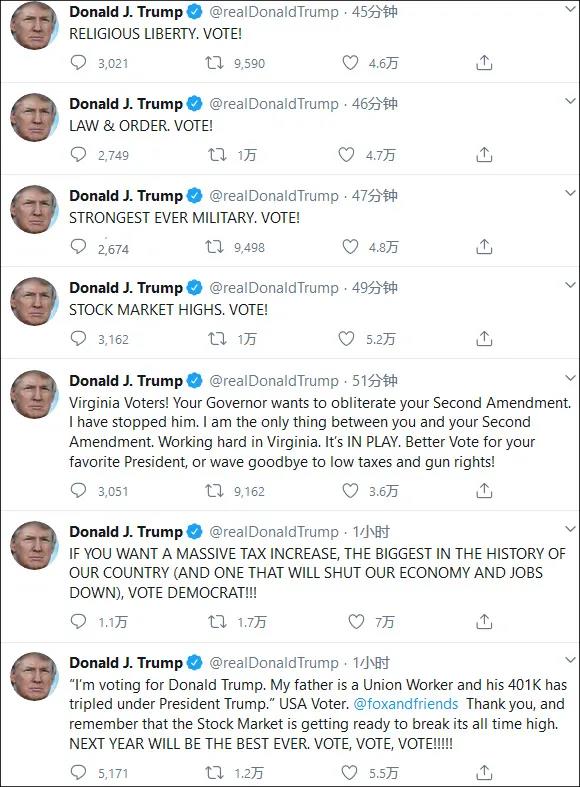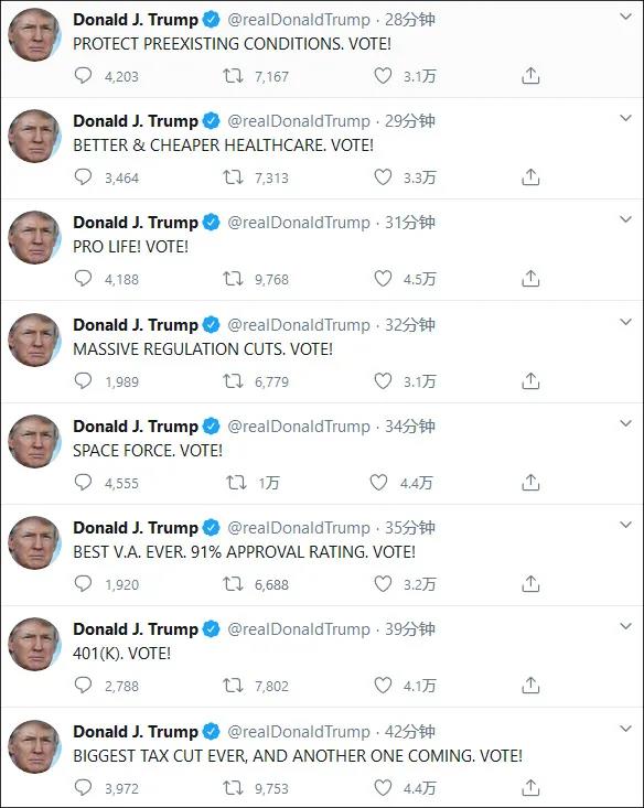 但没过多久特朗普推文的「画风」就完全变了,他逐条列举了他各种包括「法律与秩序」、「优质便宜的医疗」、太空军在内的「丰功伟绩」,而且这十多条推文都配上了一句「投票!」(VOTE!)。不仅如此,特朗普还特意使用了大写字母来强调这一切。